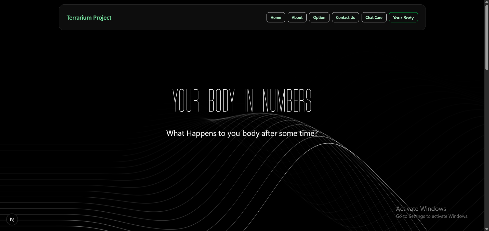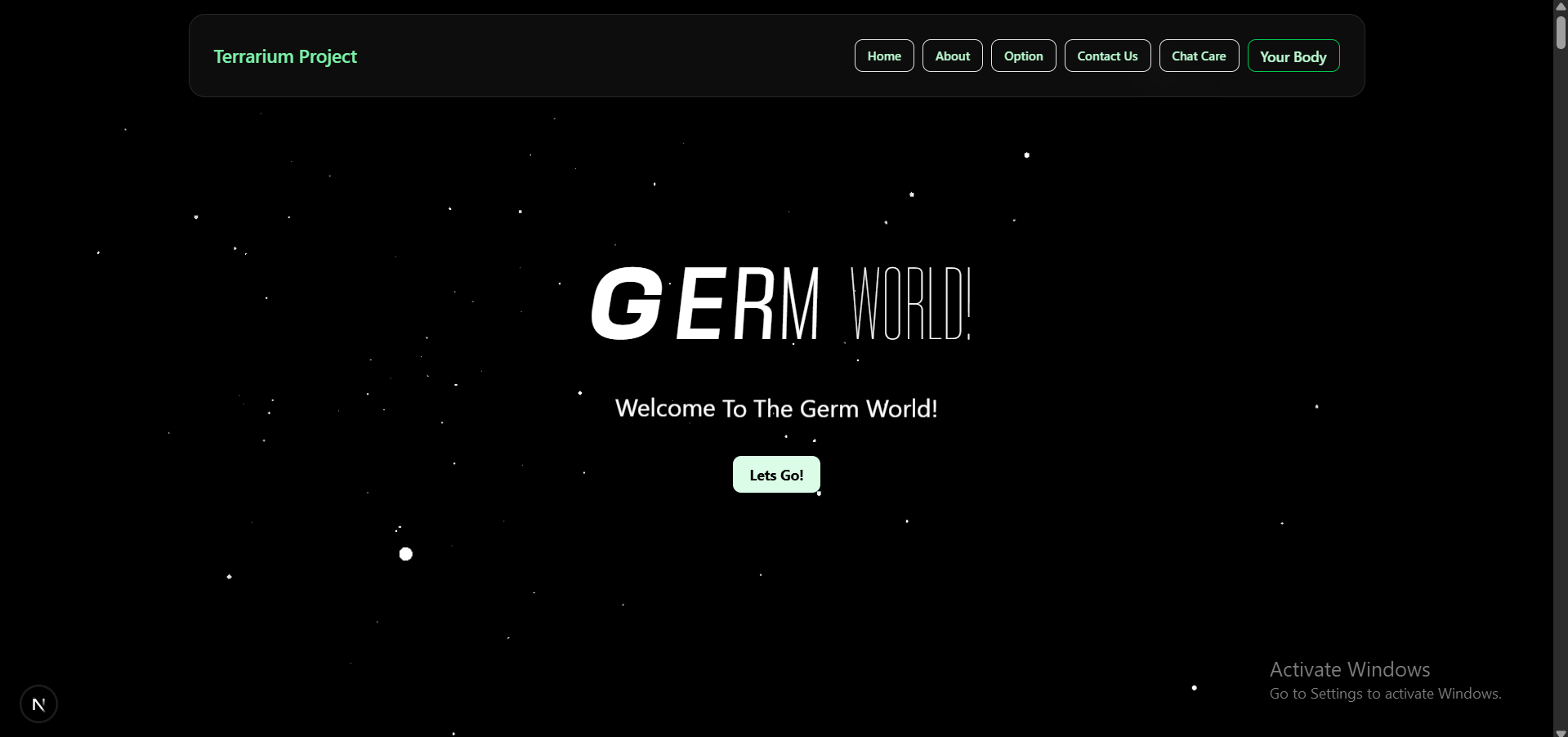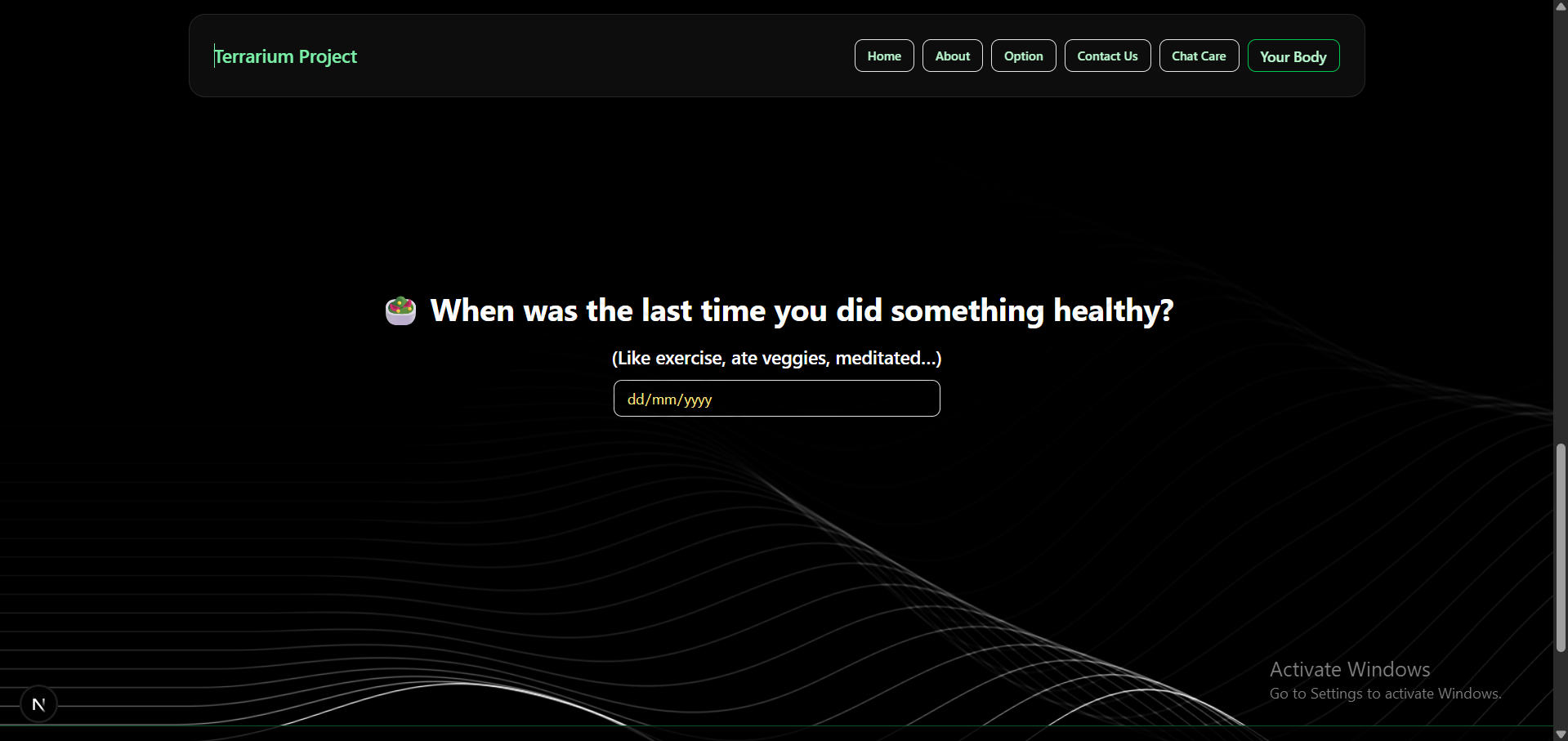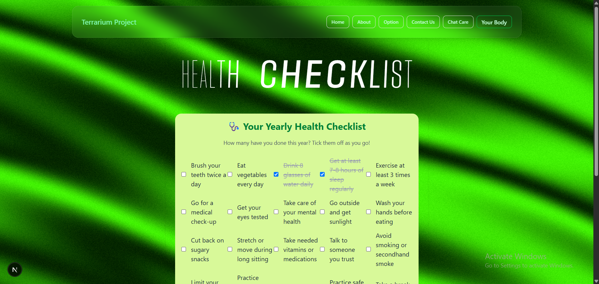 Terrarium is inspired by the interactive and playful style of Neal.fun, a site where learning is driven by curiosity and creativity. We wanted to bring that same joyful and accessible learning experience to the topic of health and well-being—targeted at kids, teens, or anyone looking to explore health in a fun way.