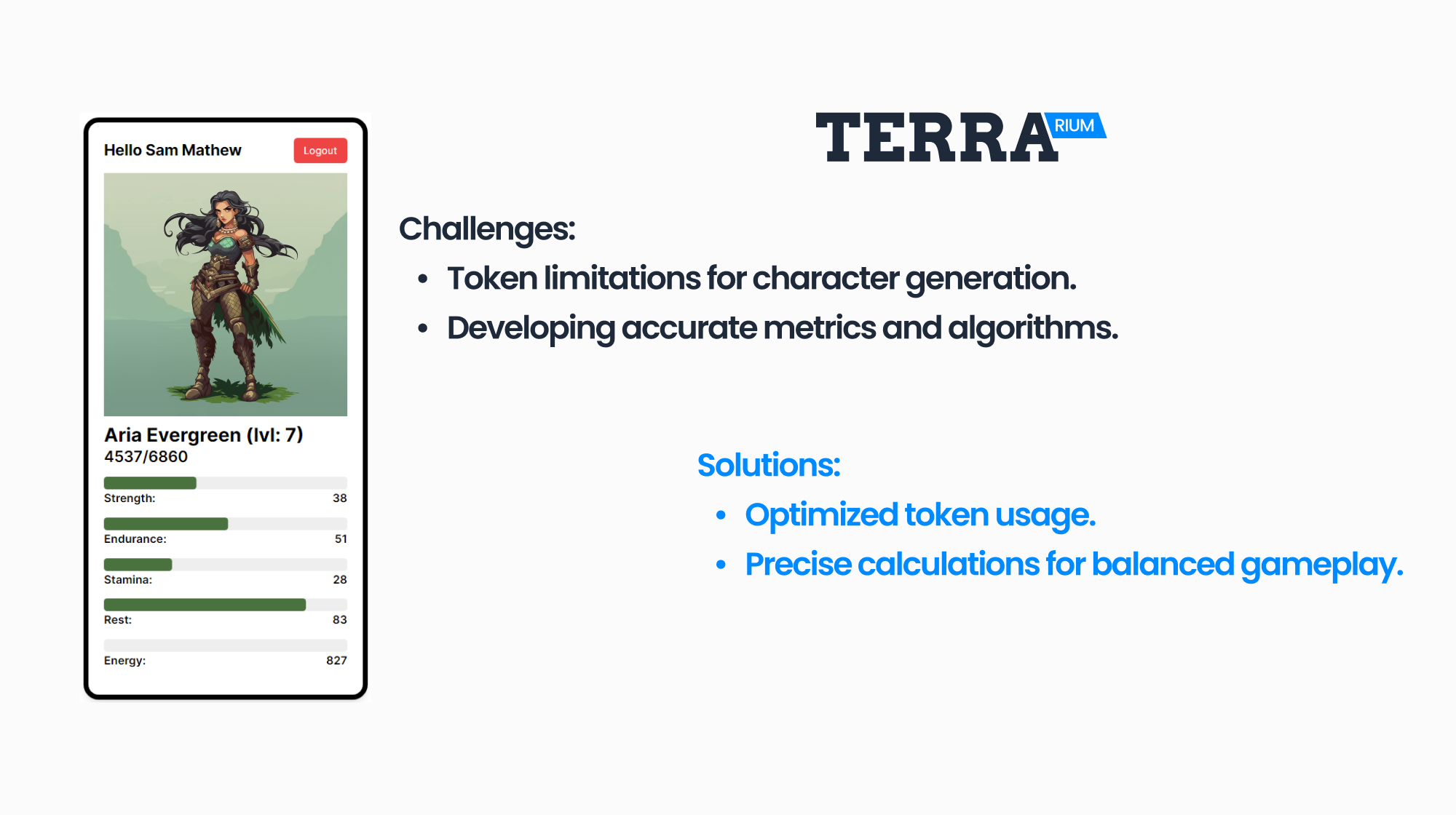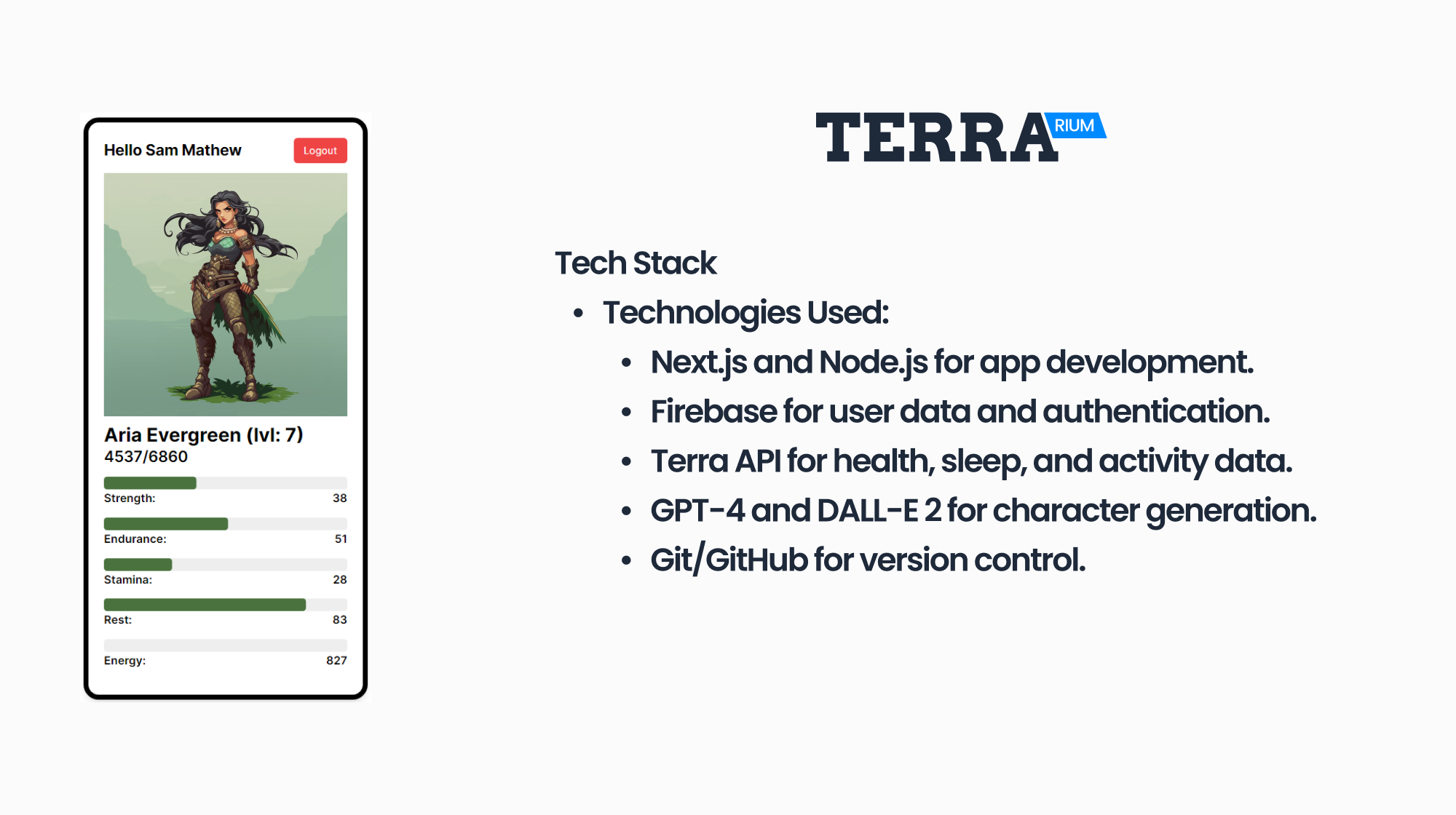 To create TerraRium, we used the power of modern technology. We built it with tools like Next.js and Node.js, and we used Firebase for handling user data and authentication. We also connected to the Terra API to gather health, sleep, and activity data and a little bit of Math Magic in our algorithm for calculations.