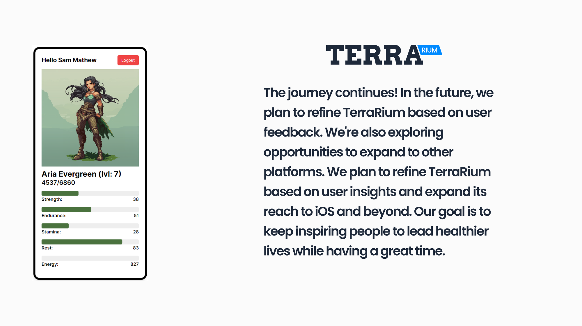The journey continues! In the future, we plan to refine TerraRium based on user feedback. We're also exploring opportunities to expand to other platforms. We plan to refine TerraRium based on user insights and expand its reach to iOS and beyond. Our goal is to keep inspiring people to lead healthier lives while having a great time.