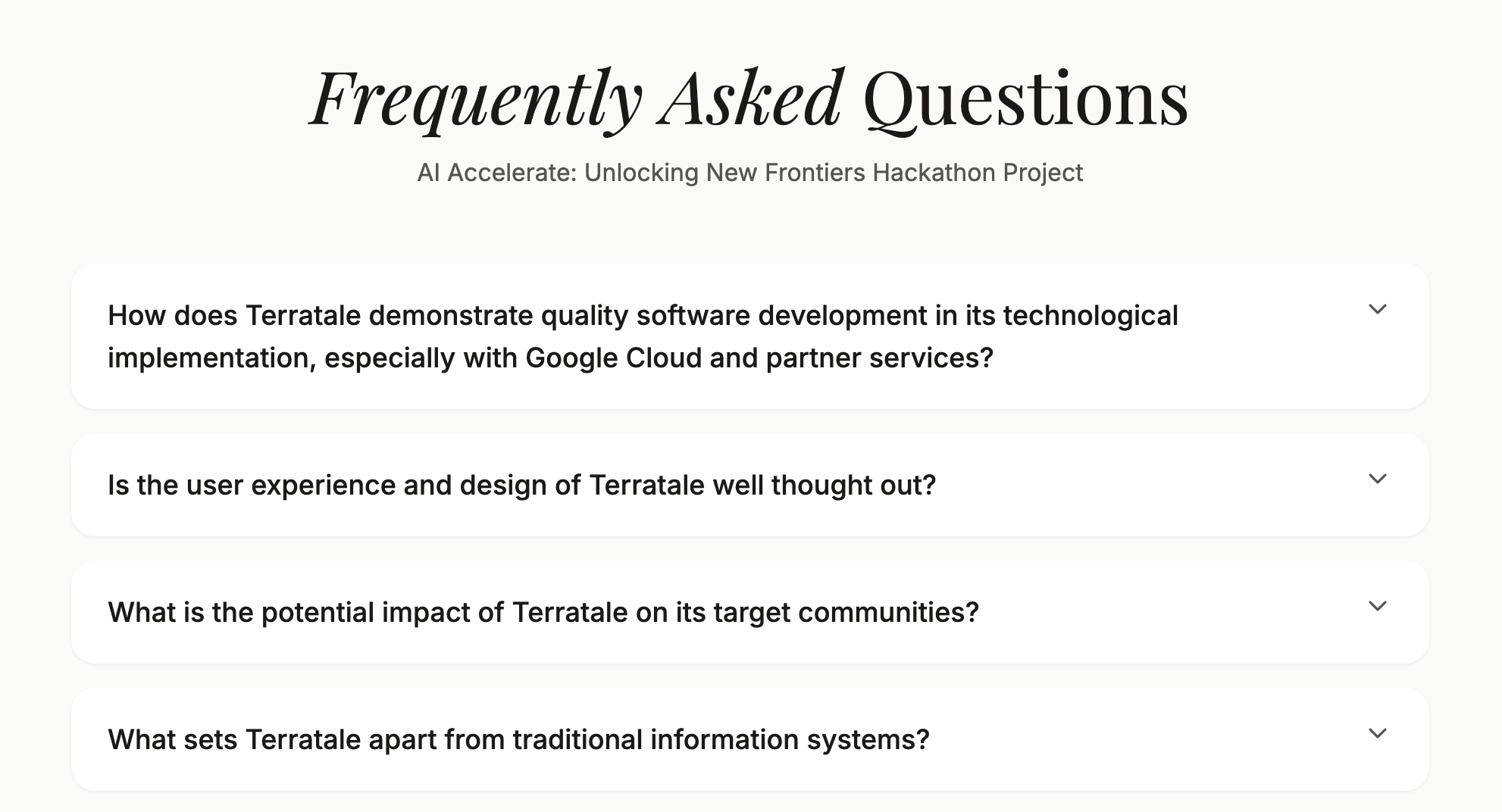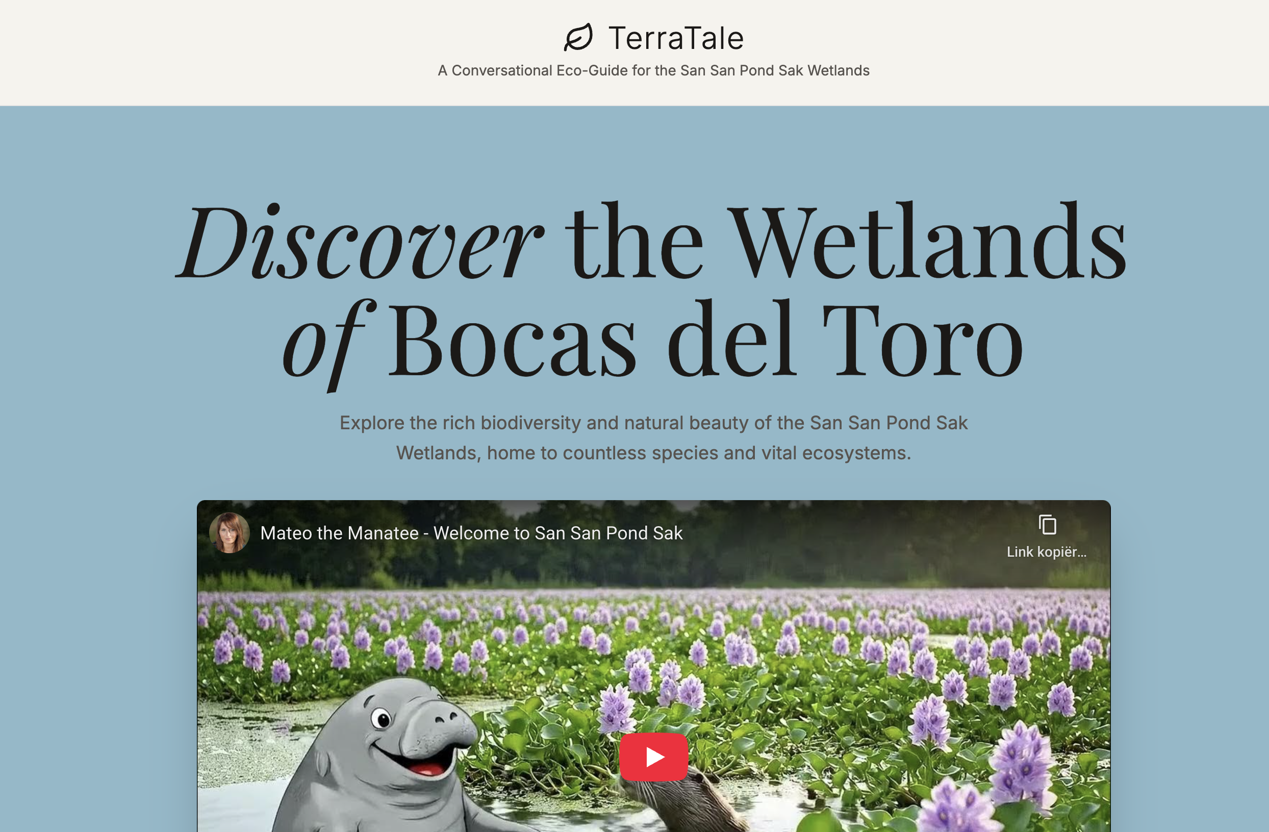 TerraTale is an intelligent, conversational eco-guide designed to enhance the visitor experience in the San San Pond Sak wetlands. It features real-time voice interaction where users can have natural conversations about wildlife they encounter, asking questions like "I saw a bird with a special beak" and receiving instant audio responses. The system uses conversational AI to guide users to identify species through follow-up questions, then displays matching images from our curated wildlife database. Users can also interact through text chat, exploring the wetlands' diverse ecosystem including jaguars, manatees, sea turtles, and hundreds of bird species. The system intelligently recognizes user intent through contextual understanding of ongoing conversations, providing either detailed text explanations or performing semantic image searches to show relevant wildlife photos with proper scientific identification.