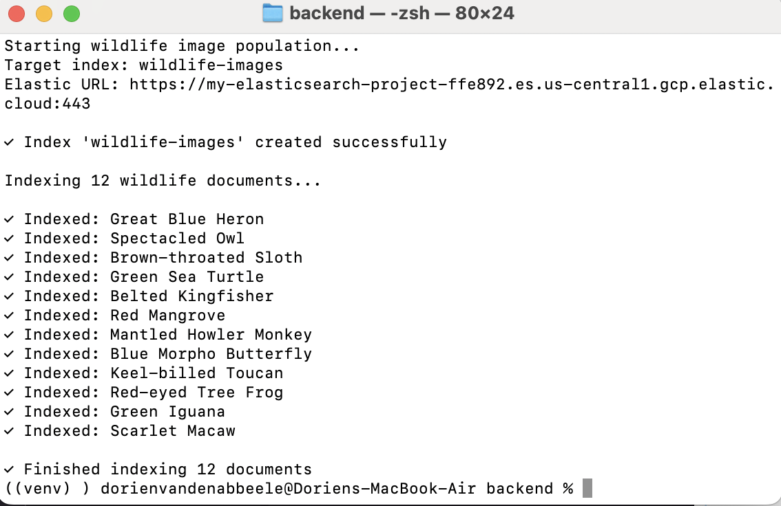 - Elasticsearch Cloud serves as our semantic search engine, enabling natural language queries against wildlife images with fuzzy matching and relevance scoring