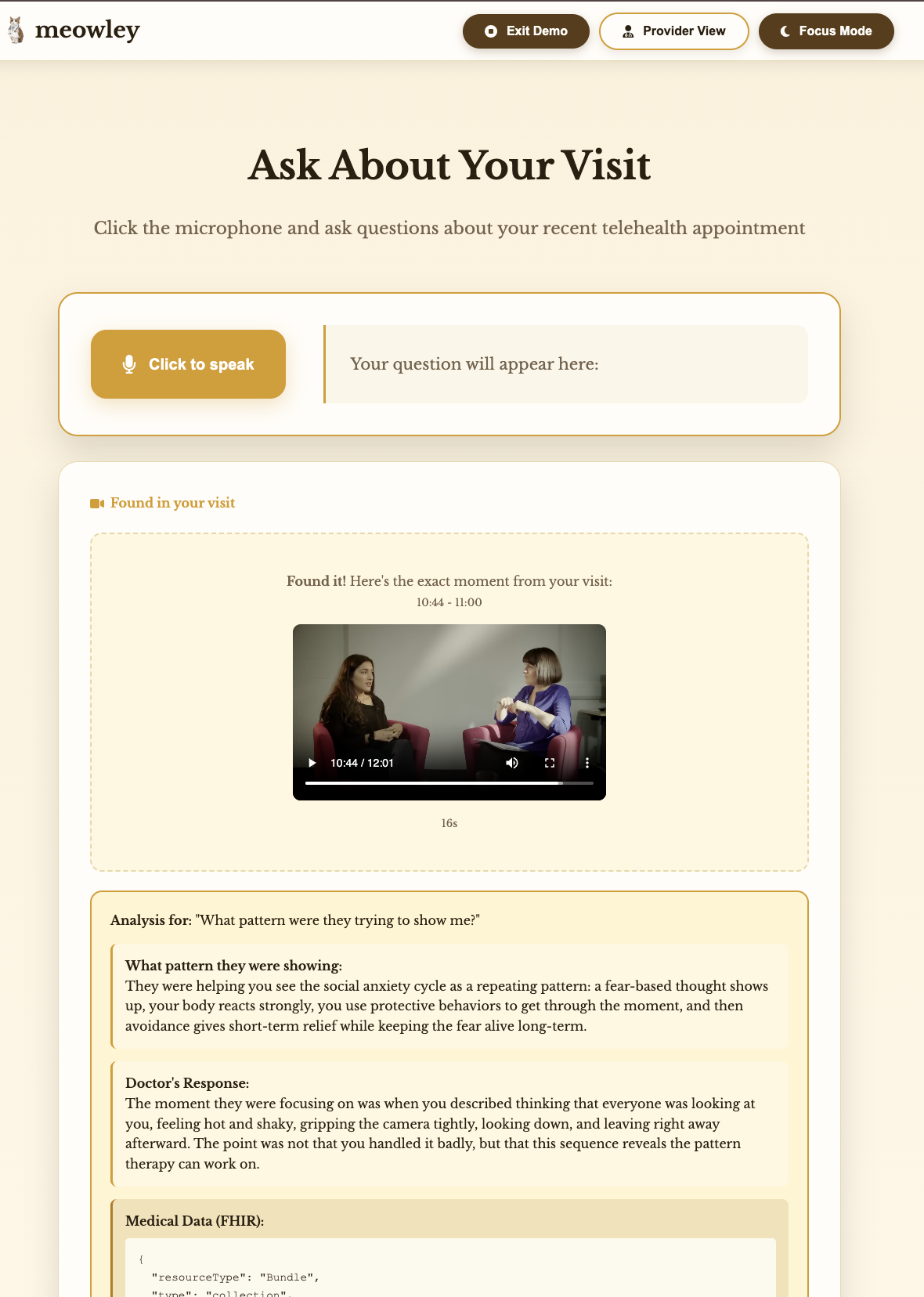 Meowley allows users to upload their telehealth recordings and interact with them. Instead of re-watching a long video, you just ask a question like, "What was the idea being reinforced from my appointment?"
