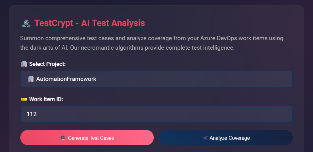 TestCrypt is an AI-powered test case necromancer that resurrects intelligent test cases from Azure DevOps work items: