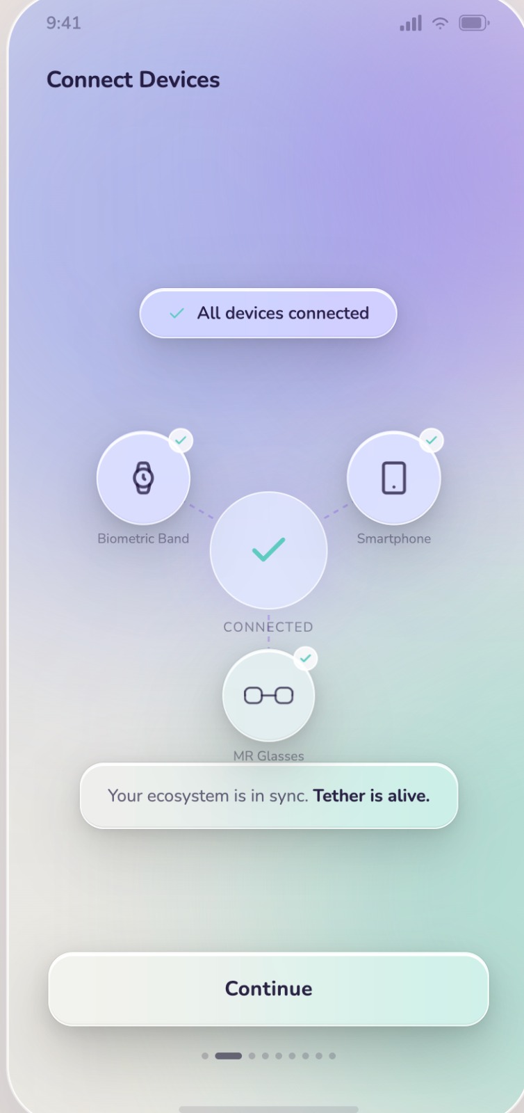 Designing Tether involved several key challenges. Social dynamics are complex and subtle, making it difficult to translate abstract social signals into clear and meaningful insights. We also had to balance providing assistance with preserving natural human interaction, ensuring the system supports users without interrupting or controlling their behavior. Another challenge was designing a minimal MR interface, where visual cues remain subtle and helpful without overwhelming the user’s perception of the real environment. Additionally, working with sensitive biometric data required careful consideration of privacy, security, and responsible data use. Finally, we had to find effective ways to visualize an otherwise invisible process combining internal physiological signals and environmental sensing into a clear, understandable experience for users.