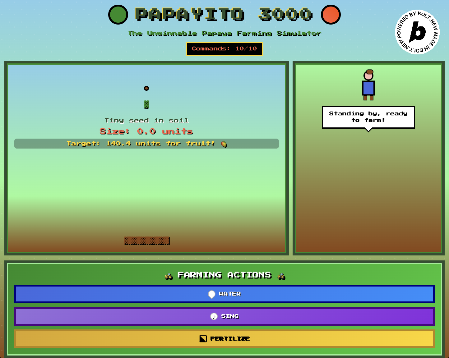 Papayito 3000 is a deliberately unwinnable farming game where the player nurtures a papaya tree through watering, singing, and fertilizing commands, but just as the tree is about to bear fruit, a giant fly eats it, ending the game with a humorous "game over" and a leaderboard titled "Everyone’s a loser herre".