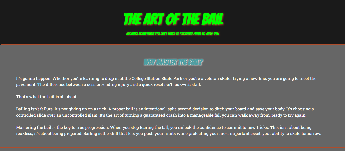 My project is a simple webpage that provides beginner skateboarders with injury prevention tips. Skateboarding is not talked about as much as other sports, and as a beginner, it may be hard to learn how to skateboard safely. This webpage hopes to provide a one stop shop for beginners wanting understand safety.