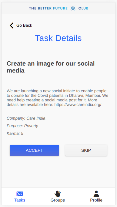 - The 'volunteers' are given the tasks that are the most suited for them, based on their skill sets, interests and time availability, for the causes that they care about.