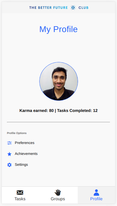 - Volunteer side facing app for people to see their tasks, keep track of achievements, network with others and redeem points.
