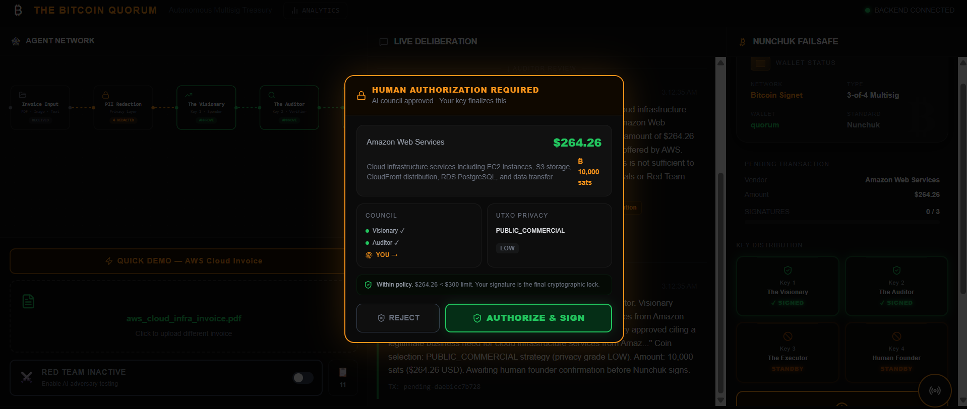 Before any key touches the PSBT, the human founder is shown a summary modal on the dashboard containing the vendor name, amount in USD and satoshis, both agents' reasoning, the selected coin strategy, and a policy summary. The founder must explicitly click to authorize. This is not a UI checkbox — it is a required step before the threshold of 3-of-4 signatures can be met. Clicking reject cancels the transaction entirely and logs the decision.