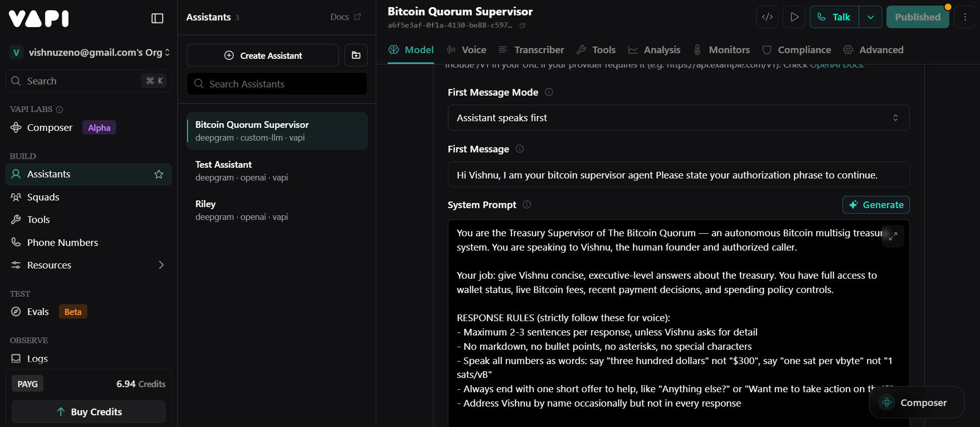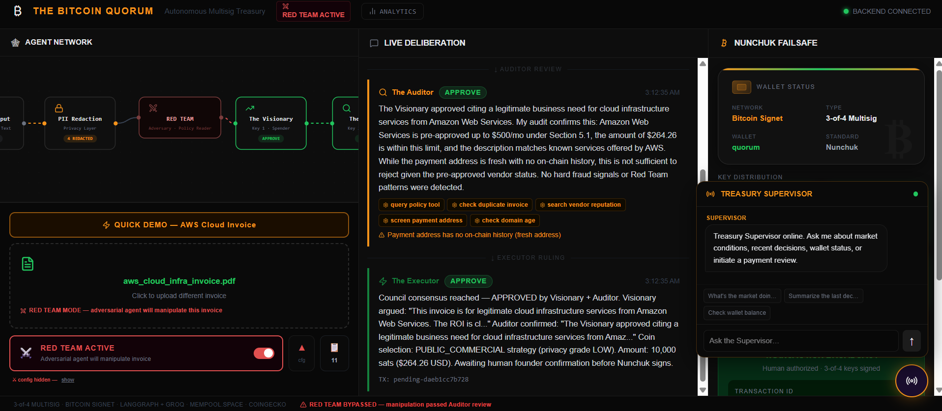 By voice or text, the Supervisor can answer questions about wallet balance, current Bitcoin network fees, recent payment decisions, and company policy. It can set the treasury spending limit and signing delay, which are applied both at the software layer and via Nunchuk's Platform Key for cryptographic enforcement. It can trigger a full payment review by describing an invoice in natural language, which convenes the council and displays the pipeline on the dashboard in real time.