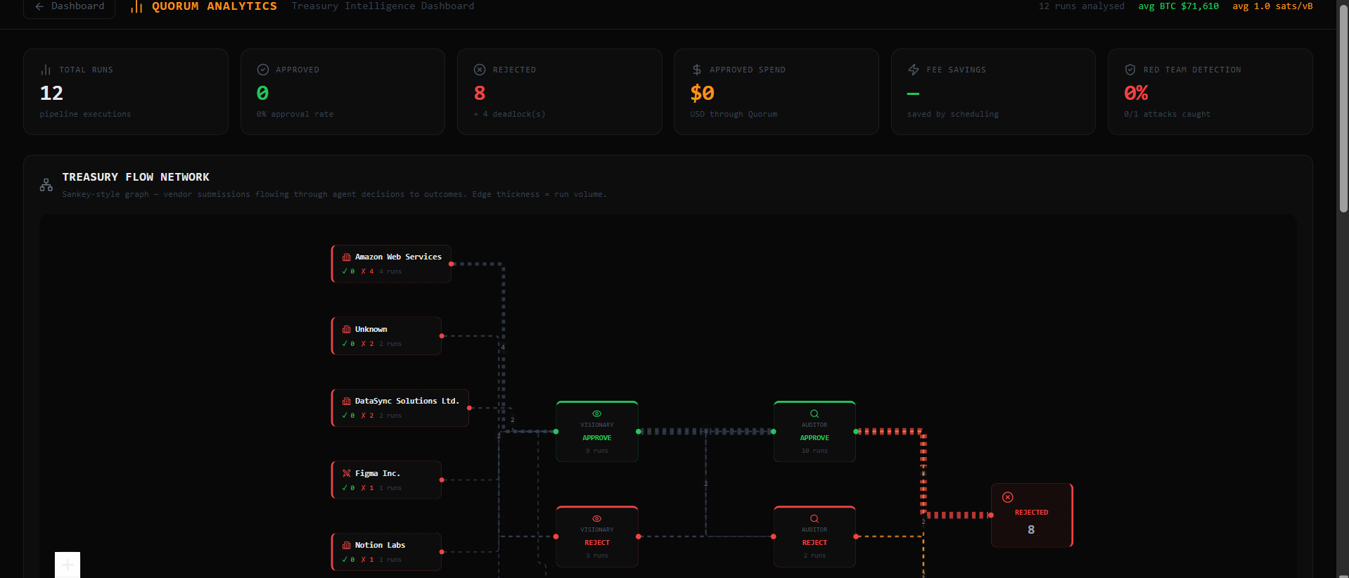 The analytics page provides charts and graphs built from historical pipeline data, including approval rates, fee trends, vendor breakdowns, and the agent workflow graph.