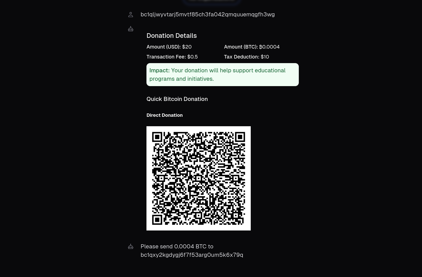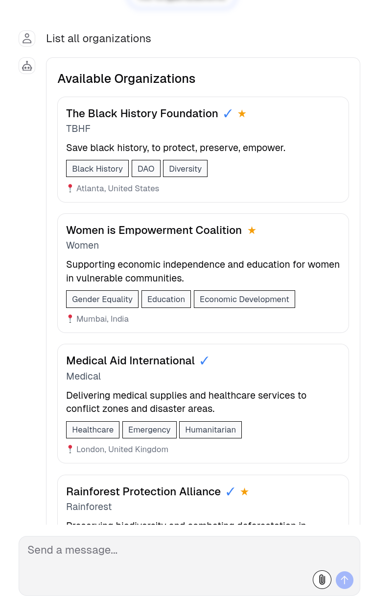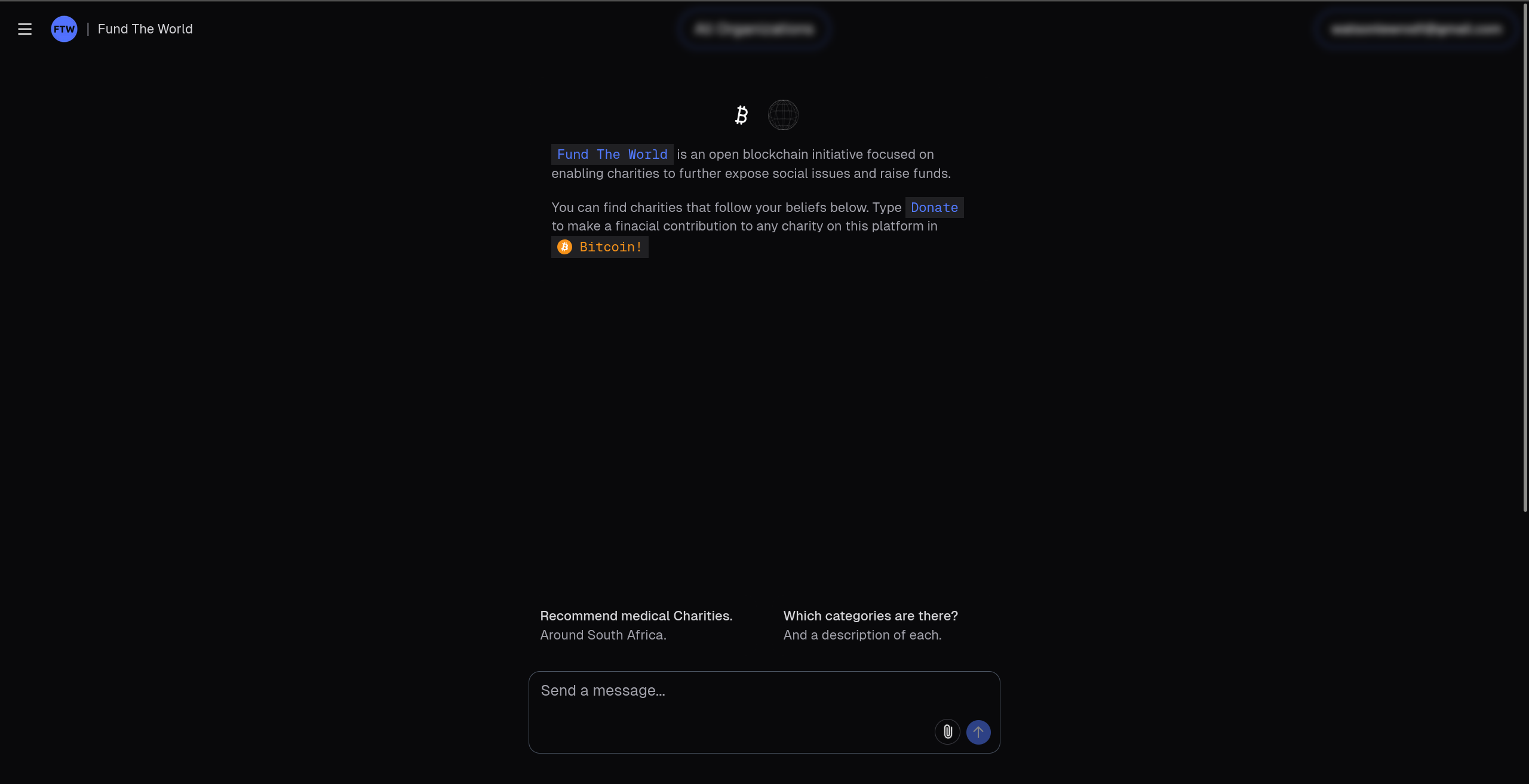 Fund The World bridges the gap between Bitcoin holders and global charitable impact. Our platform allows users to chat with an AI assistant that helps them discover charity organizations accepting Bitcoin donations that align with their values and interests.