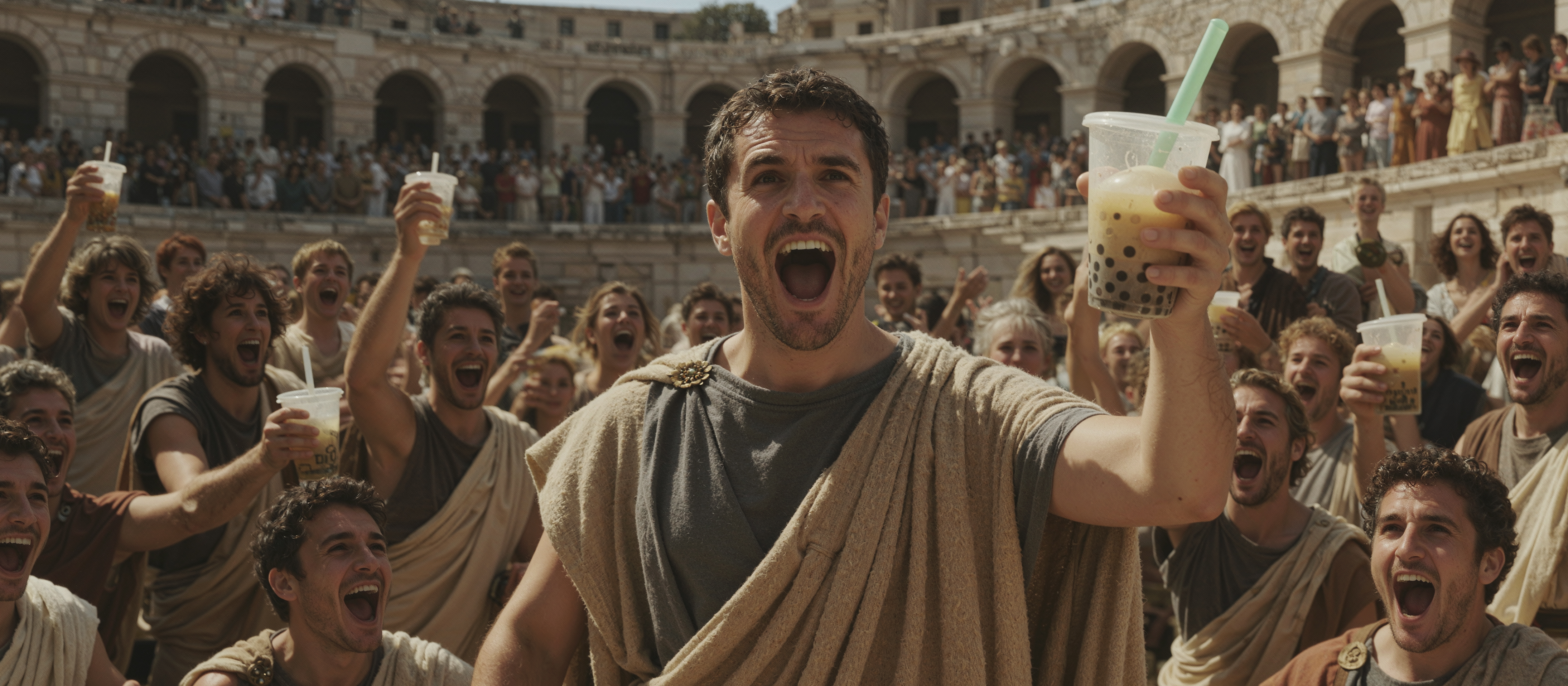 I wanted to blend Taiwanese bubble tea culture with Roman gladiator aesthetics to create a clash of cultural elements that delivers a striking visual impact. This concept felt perfect for exploring with AI tools to push creative boundaries.
