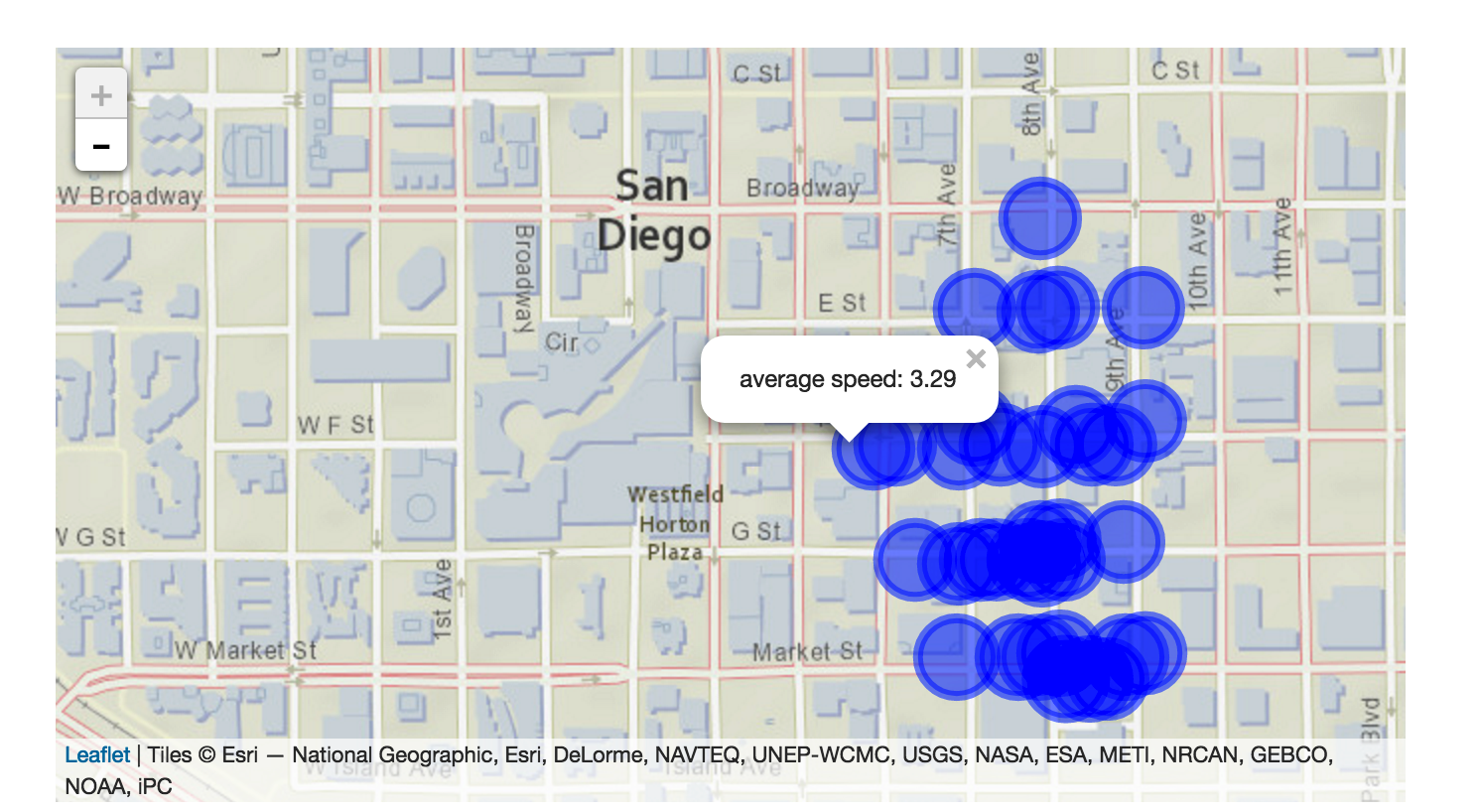 We allow the city planners to adjust the beginning time and the end time of a day and intuitively check the size of the legends on the map rendered by the leaflet library. We also provide the functionality to switch from traffic data and the pedestrian data. If the user wants, he or she can check the hourly change as well from an independent graph.