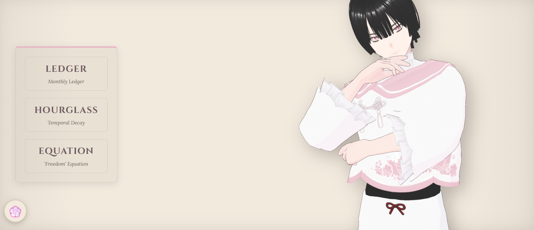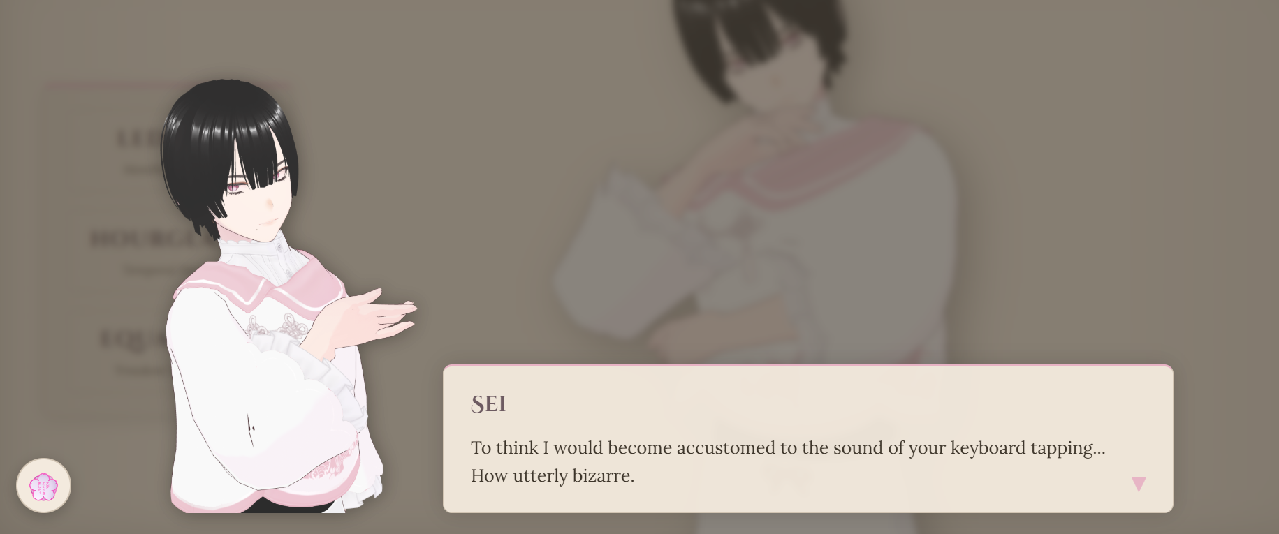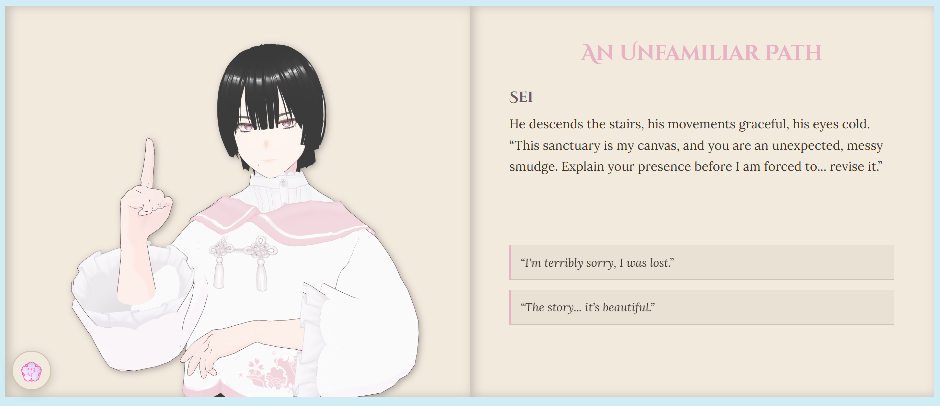 You meet Sei (a name inspired by the kanji 生, for life), a creator, artist, who has perfected his world but closed himself off. By showing kindness and curiosity, you slowly build a bond with him. This unlocks two other areas of his sanctuary: