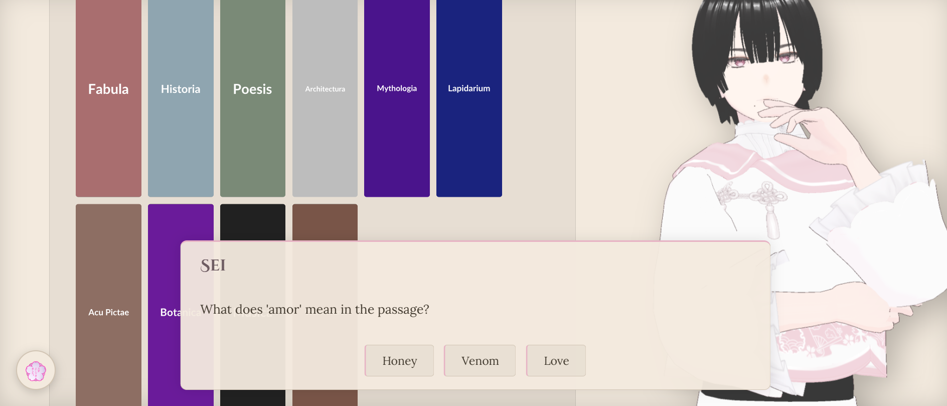 - The Library (Education): You explore his book collection, and he, surprisingly, is a passion teacher(just a bit), quizzing you on topics Latin.