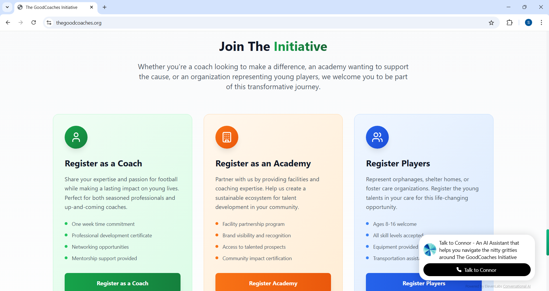 The platform was built using Bolt, with a full Supabase backend to handle authentication, user data, and role-based registrations. A conversational AI onboarding assistant — powered by ElevenLabs — guides users through the experience and answers FAQs via voice and text.