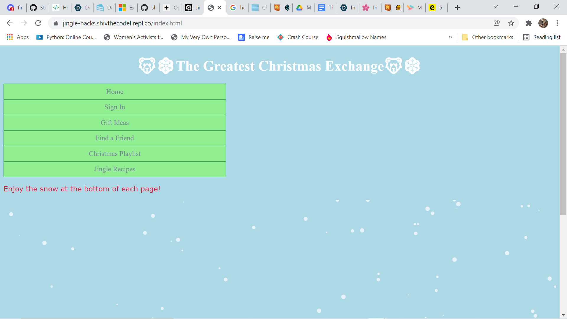 While I have participated in another Hackathon before in which I had to complete an entire project in one day, I had two other teammates to help me complete the project. This time, I opted to work by myself therefore having to complete an entire project within a day. I was also unsure about what Christmas/Snow themed project to create so I am proud of being able to come up with an innovative idea in a short period of time.