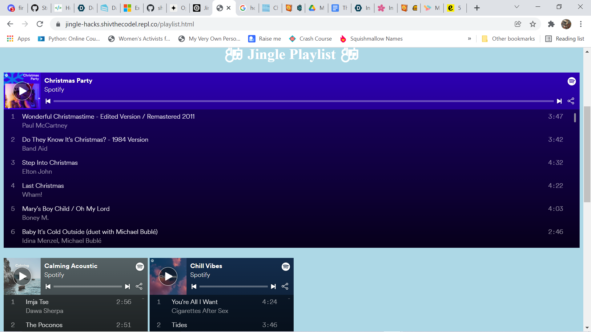I built this website using Repl.it, HTML, CSS, Javascript and Django. I also used spotify to add the playlists.