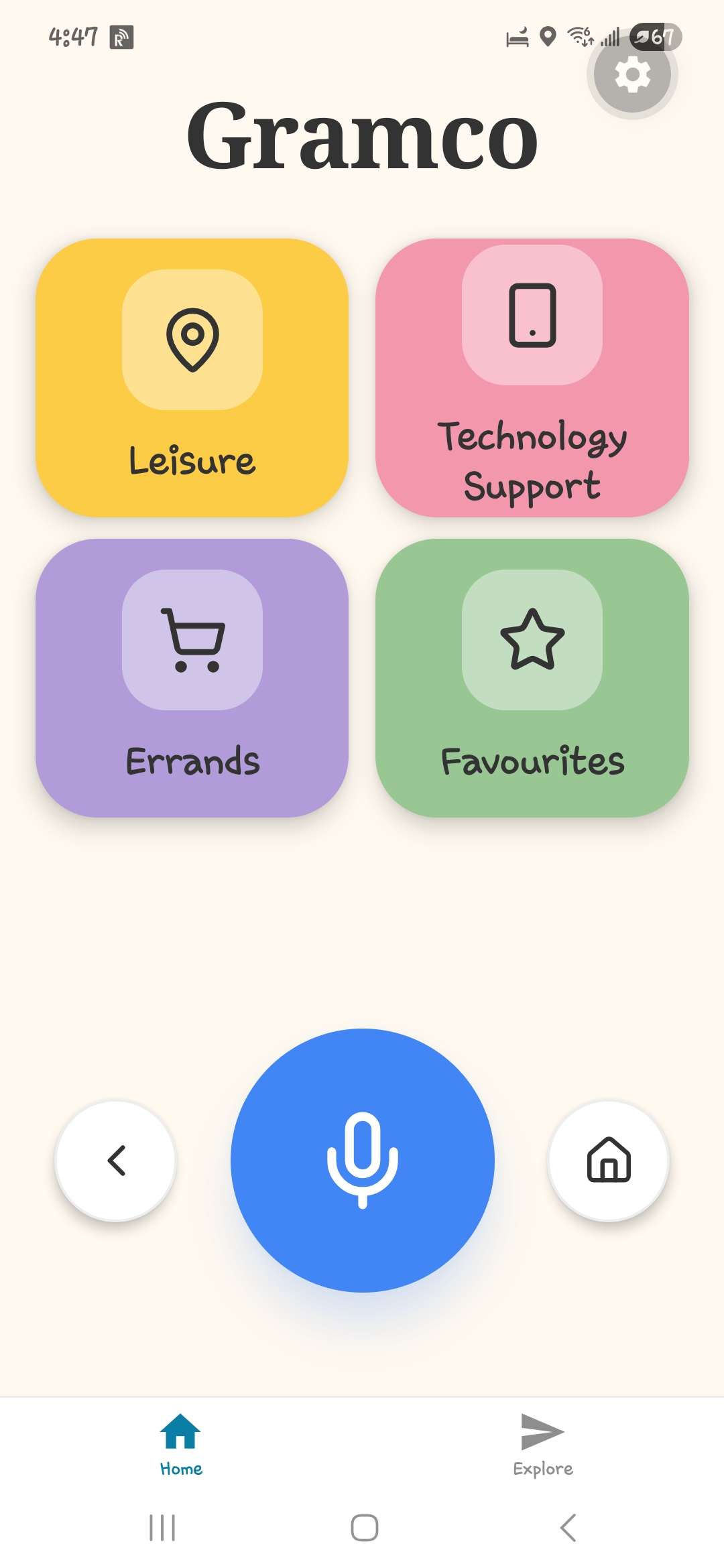 Gramco is a centralised micro-service tool that targets the everyday needs of the average Canadian senior into one simple mobile app. It is a voice command-based system that simplifies tasks that exclusively require the use of technology such as reserving a spot at a restaurant or connecting with family and friends over Whatsapp. The mobile app does not require any touch screen interaction except the press of the mic button to speak into the phone. The micro-tasks are split into 3 main categories of service (leisure, errands, technological support). Each task is further split into 3 sub categories, depending on the user needs. Each split in category can be directed with voice or touch depending on user preference. Seniors usually prefer speech as it is the closest to giving a phone call, or speaking to a real human.