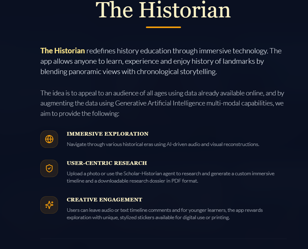 The app was inspired by my travel journeys. I wanted to build an app that would allow people to immerse into the history of places of interests, making the learning experience simple, interesting and fun for everyone. The goal was to experiment with Gemini 3 API to build and enhance the user experience of learning history.