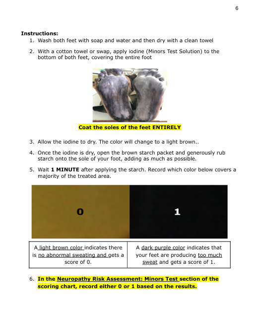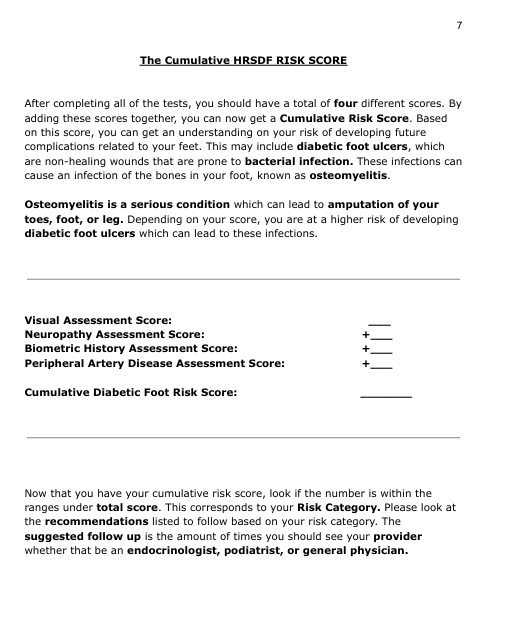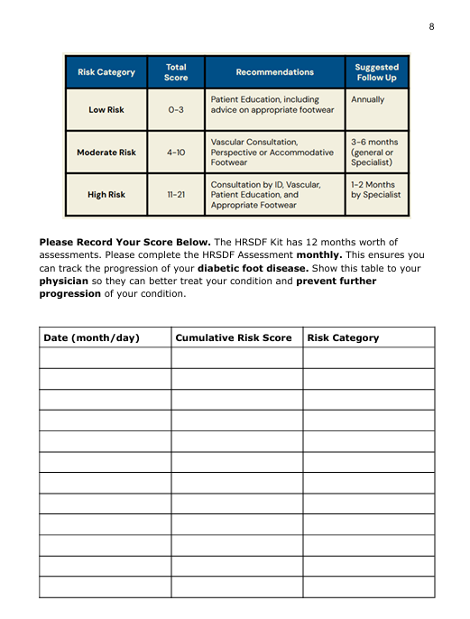 The Home Risk Assessment for Diabetic Foot Risk Assessment is a low cost, accessible, and reliable kit which contains a variety of assessments to determine the patient's risk of diabetic foot disease progression. Paired with the testing tools is a booklet that outlines how to perform the assessments, educational material on what the assessments test for, how to interpret their results, and what the next steps are for their risk category. Similar to how laboratory classes utilize active learning to enhance education, our assessment gives simple instructions while promoting patient engagement in their health. After a single test, the patient can have a better understanding on their condition and is given advice on what their next steps should be.