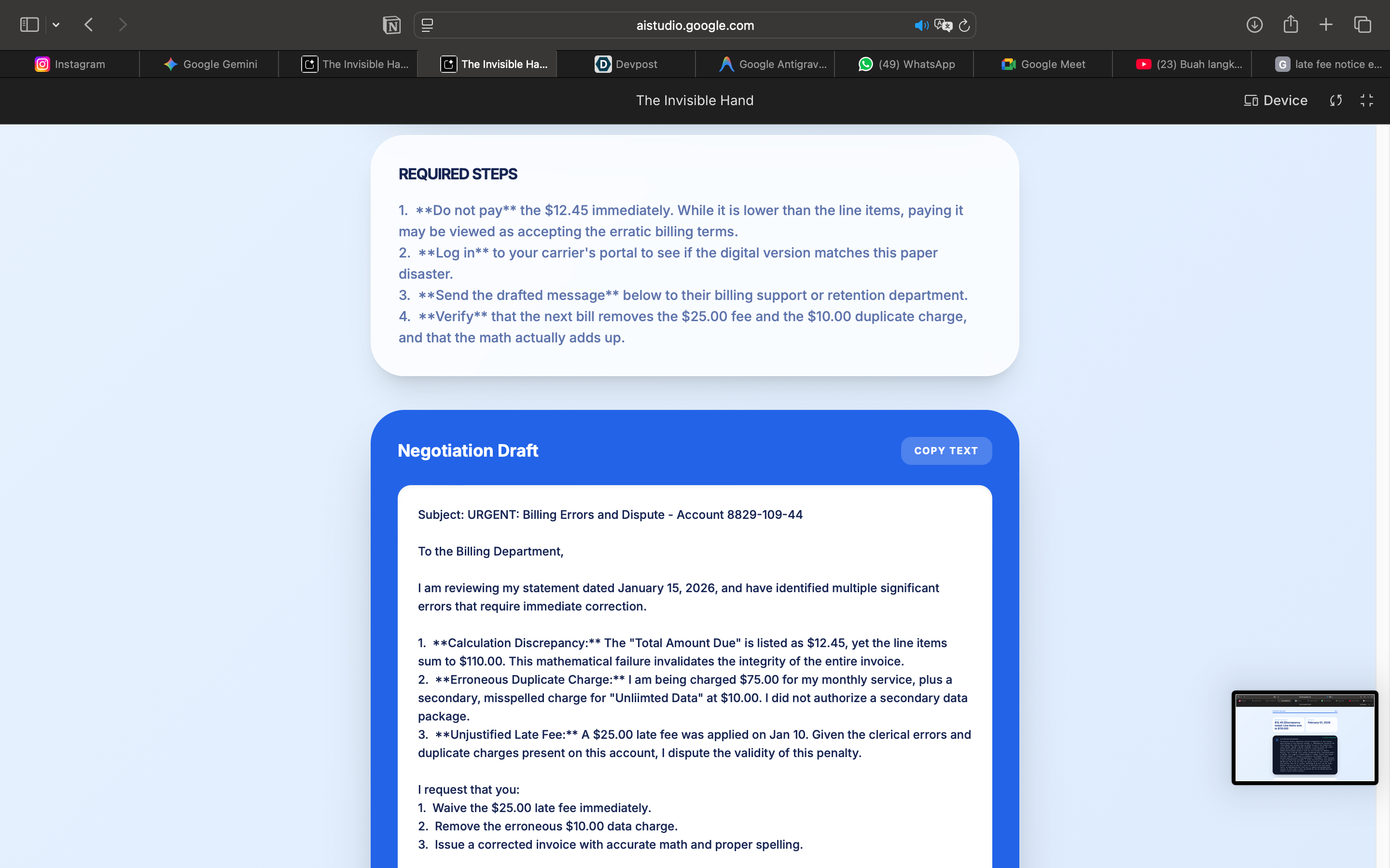 - Leveraging Multimodal Depth: I successfully implemented multimodal vision to analyze messy, real-world physical documents. The agent’s ability to extract specific data from a photo of a bill and immediately apply it to a negotiation strategy demonstrates the "spatial-temporal" understanding requested for the Action Era.
