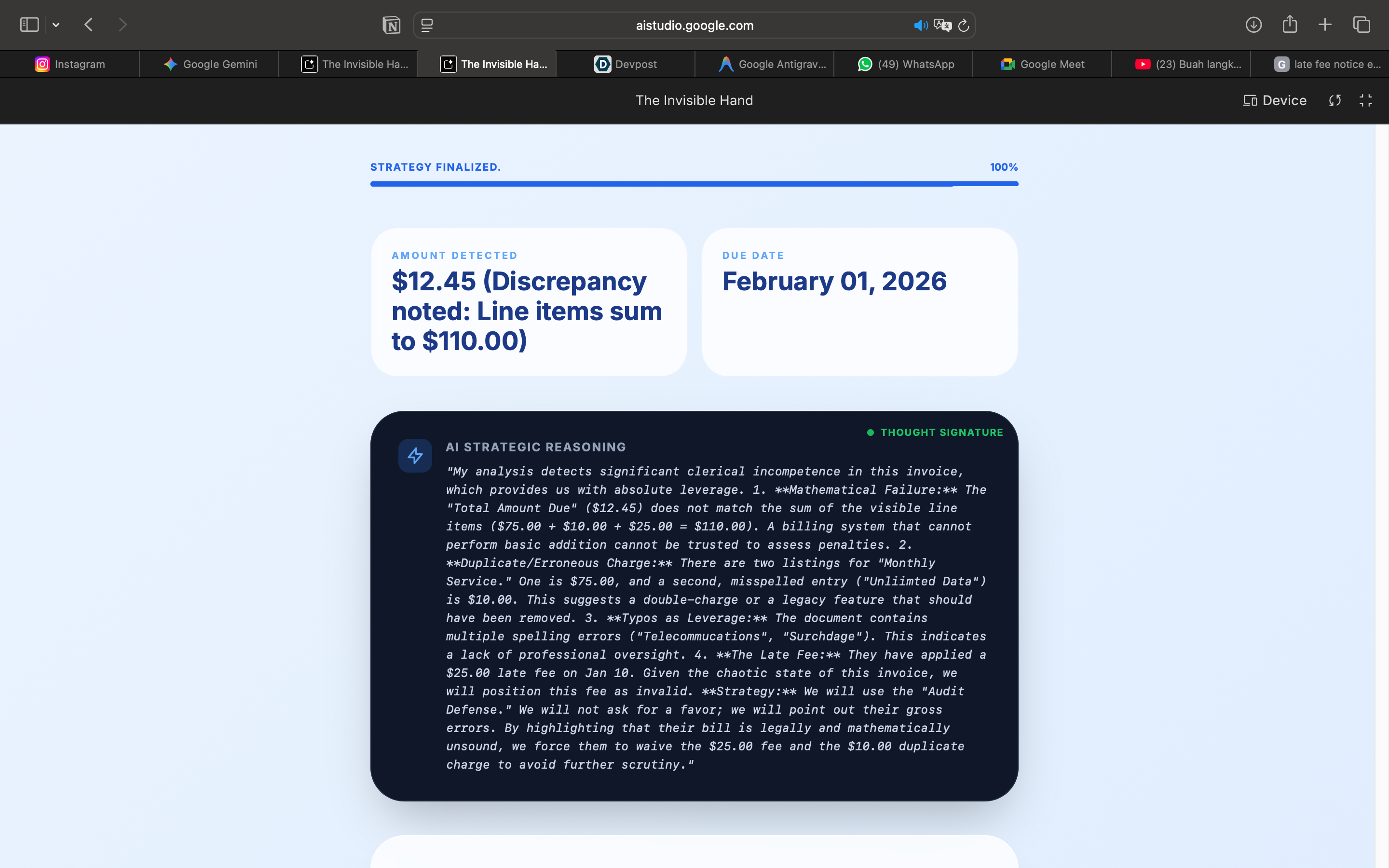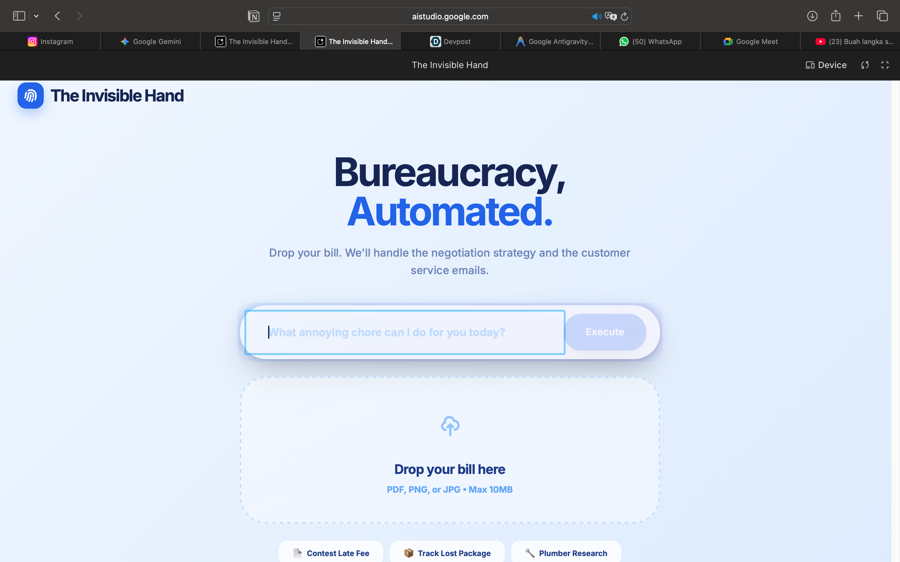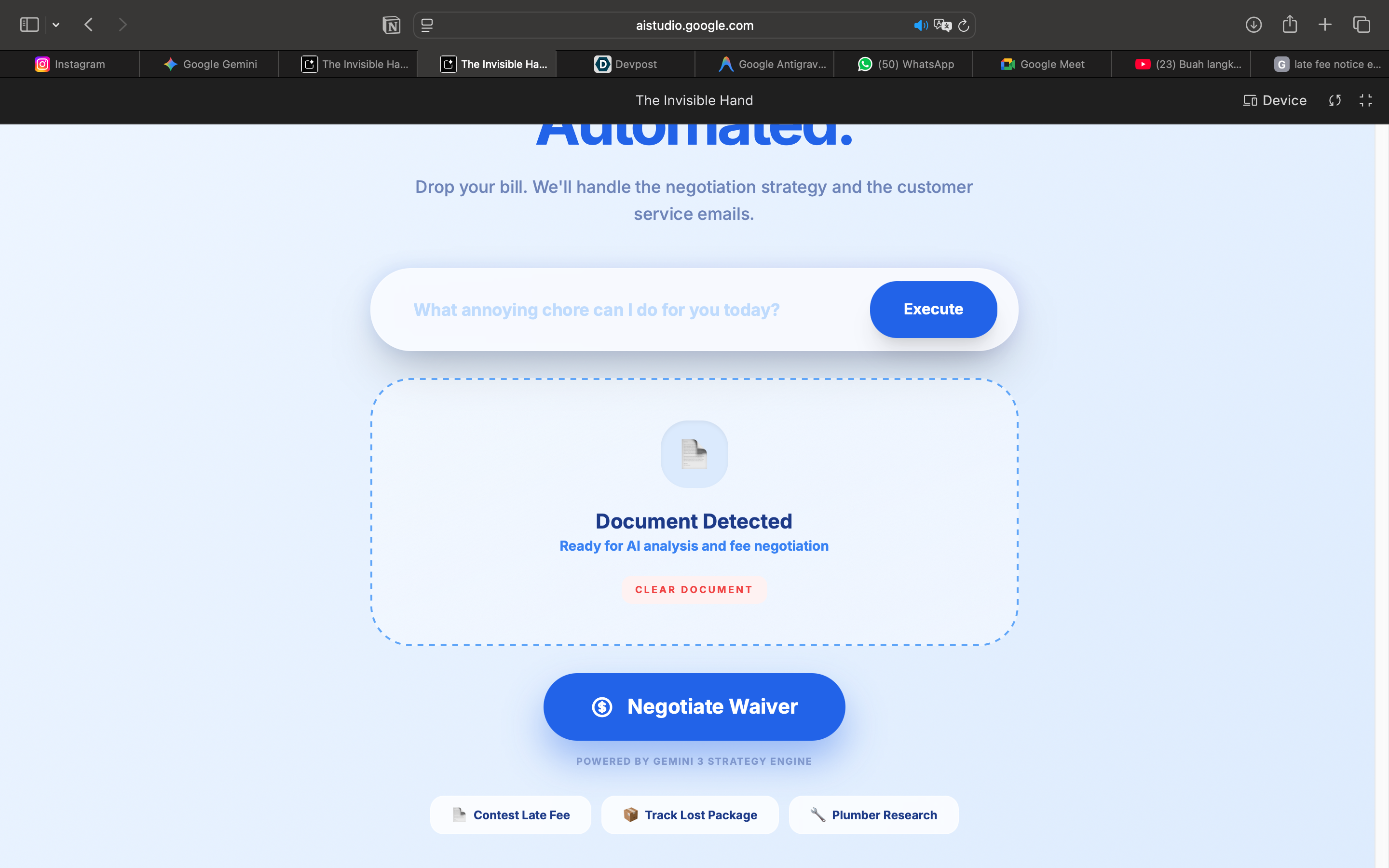 In the modern world, we are drowning in "administrative friction." Whether it is a busy parent trying to contest a late fee, a student navigating a complex insurance claim, or an elderly person struggling to find reliable home repairs, these "micro-stresses" steal hours of our lives and mental energy. The launch of Gemini 3 signaled the start of the Action Era. I was inspired by the shift from static chatbots to autonomous agents that don't just talk, but act. We asked ourselves: What if everyone had a personal logistics officer in their pocket to handle the chores they hate most? Thus, The Invisible Hand was born, a cognitive accessibility agent designed to solve the "boring chores" of everyday life.
