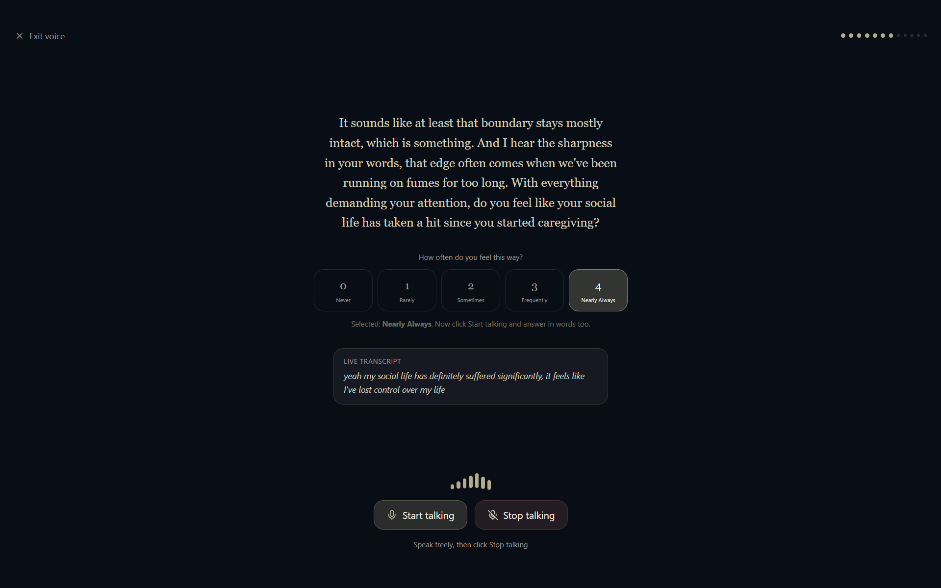 Simultaneously, the Zarit Burden Interview (12-item version) is administered, not as a form, not as a survey, but woven into natural conversation. The AI rephrases each clinical question as a moment of genuine human curiosity: "Caring for someone you love while the rest of life keeps moving, work, family, everything else, can feel like being pulled in all directions. How often does that tension feel overwhelming for you?" The caregiver can tap a 0–4 response button or type freely. Both are captured. The clinical assessment happens without the caregiver ever knowing they are being assessed.