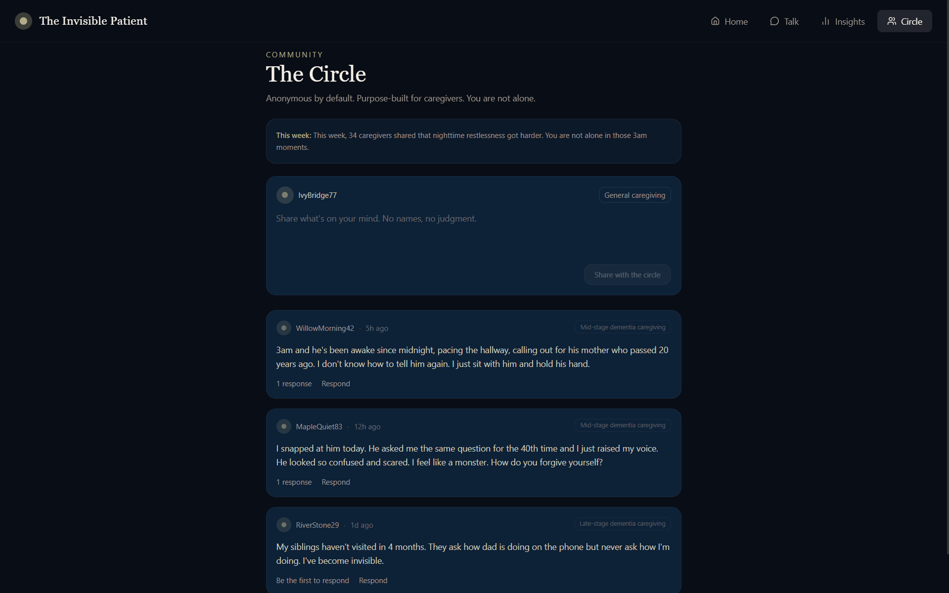 We also built The Circle , a small, anonymous forum purpose built for caregivers, because isolation is its own neurological threat. Posts are anonymous by default. An AI moderator watches for crisis language and surfaces resources immediately. Every week, the AI generates a digest: "This week, caregivers in this community shared that sundowning got worse in cold weather. You are not alone." When two caregivers share the same disease stage and overlapping emotional patterns, the system quietly suggests they find each other.