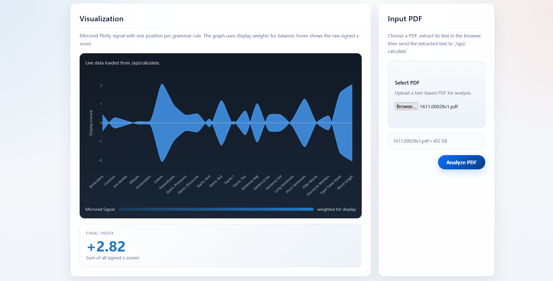 Our program takes in text and uses a variety of statistical measures to calculate a final index score where a more positive value indicates a human wrote it, and a negative value indicates an AI generated it. We call this value: "The Kevin Index".