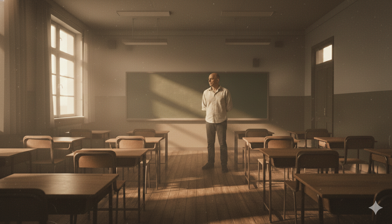 A teacher standing alone in an old classroom, with no students. Chalk dust, old desks, silence. Around this emptiness, there are quick flashes of modern technology – hints of a world that has already moved on. The film asks a direct question: **what happens to teaching when learning changes, but teachers don’t?**