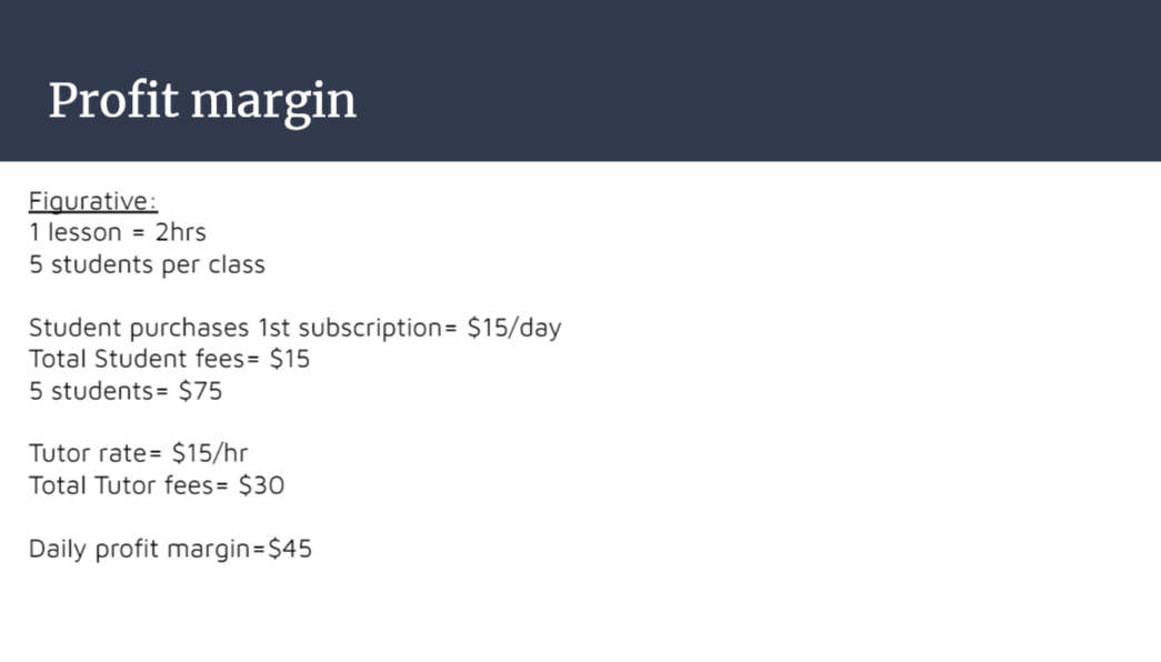 We have a business model, with a calculate profit margin of $45 a day, earnt via a subscription program on registration. We will build an improved interface, and a virtual classroom that characters can move around, to enhance interaction.
