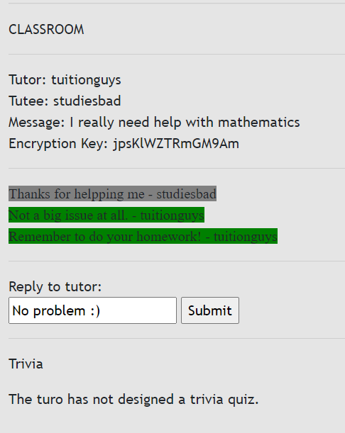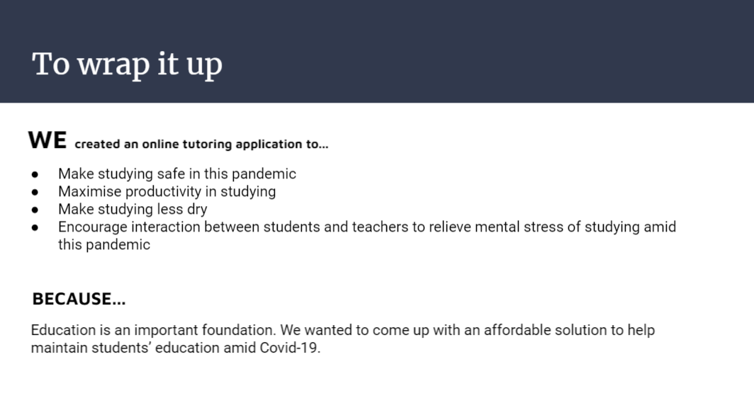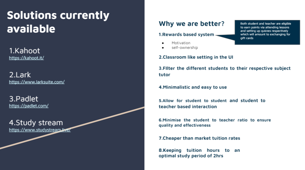 We pair tutors and tutees, allowing people to find tutors who are suitable and create a classroom. There, tutors can set up quizzes and polls and also communicate with the tutees through a chat box. There is a point system incentive, allowing users to gain points for correct answers.
