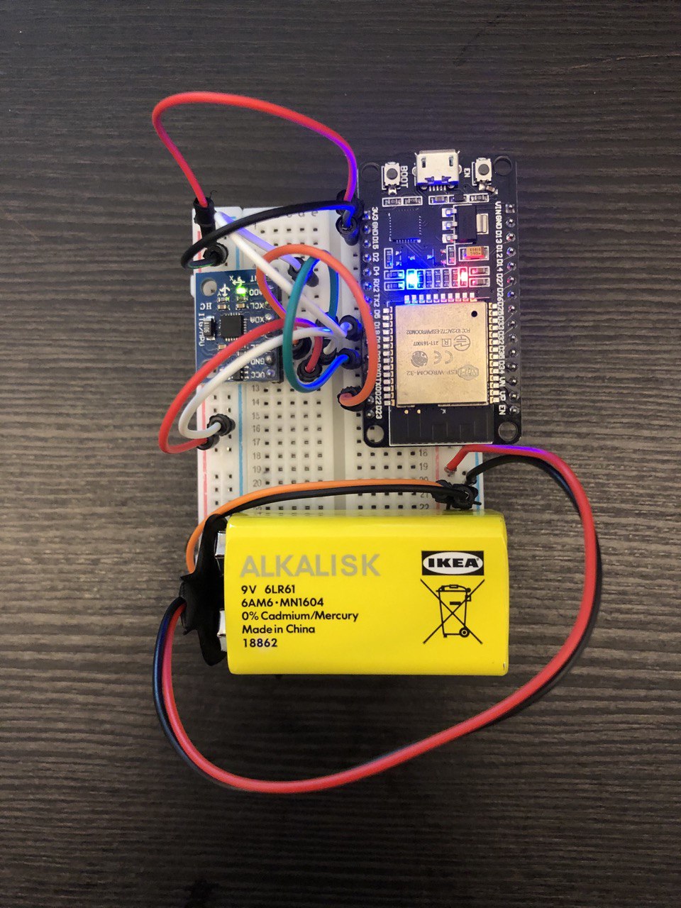We used an ESP32 to collect acceleration and gyroscope data from an MPU-6050 sensor and send the data to a web server. Using socket.io, we can send sensor data with low latency and reliably over WiFi. The webserver then processes the sensor data, with P5.js and Tone.js, to transforms the music according to user’s movements.