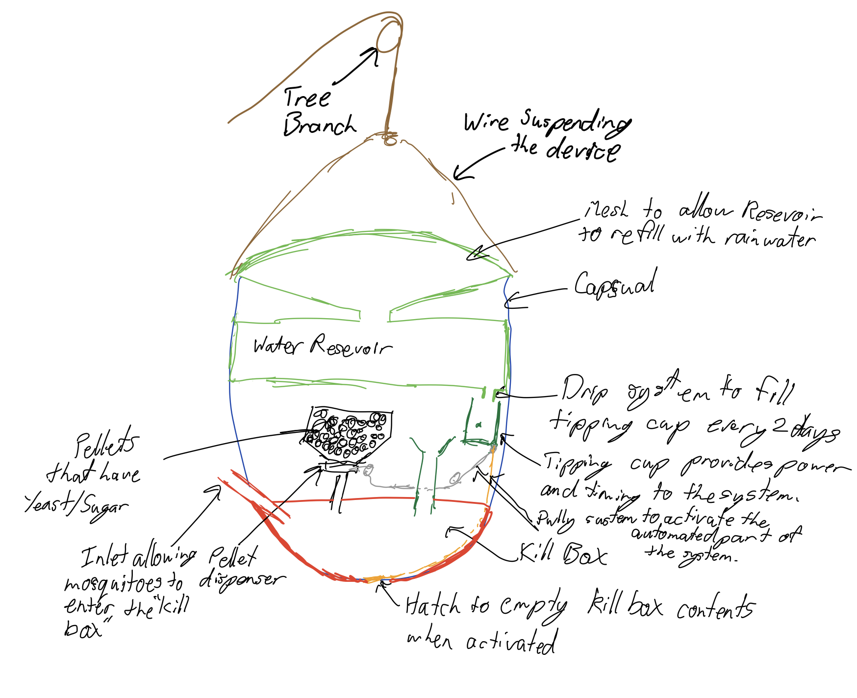 We have designed a system that can work using the same principles, autonomously, for anywhere from 2 months to an entire year depending on rainfall and the size of the reservoir. The system works by water dripping slowly from the reservoir into an off-balanced cup. When the cup fills above a certain level, it tips and activates the rest of the system, emptying the kill box and dispensing the yeast and sugar. Please see the diagram for more detail.