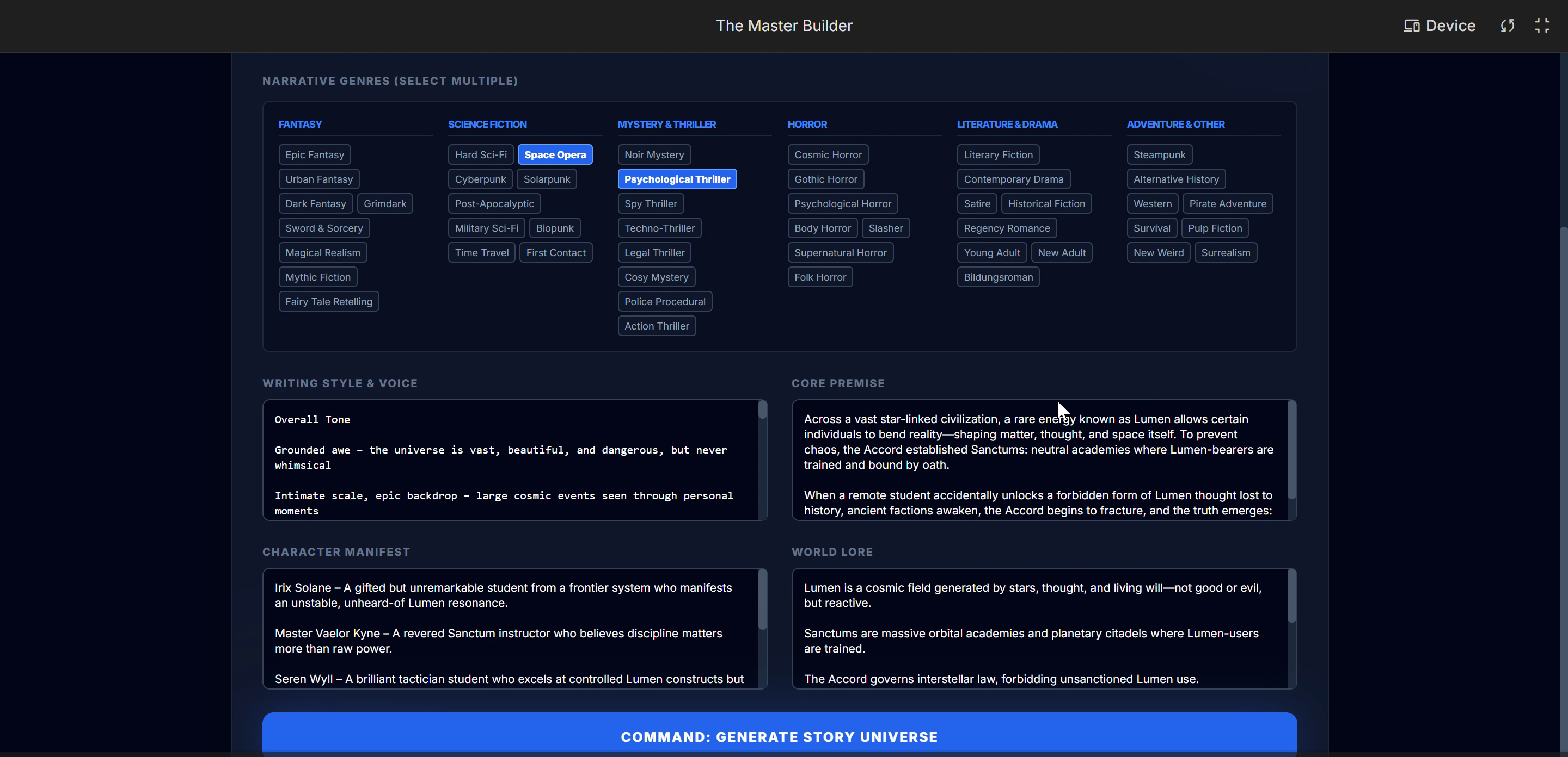 3. **Archivist:** Maintains and updates a persistent world state/lore document.