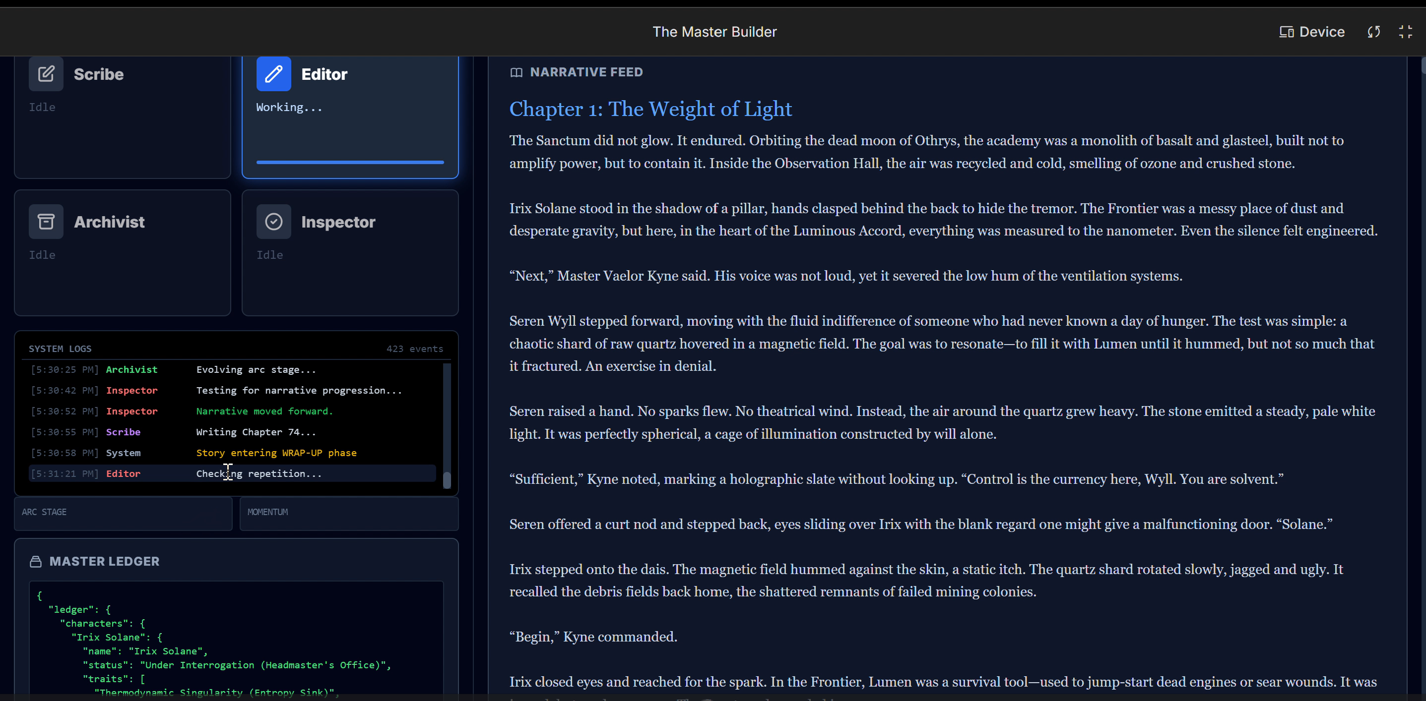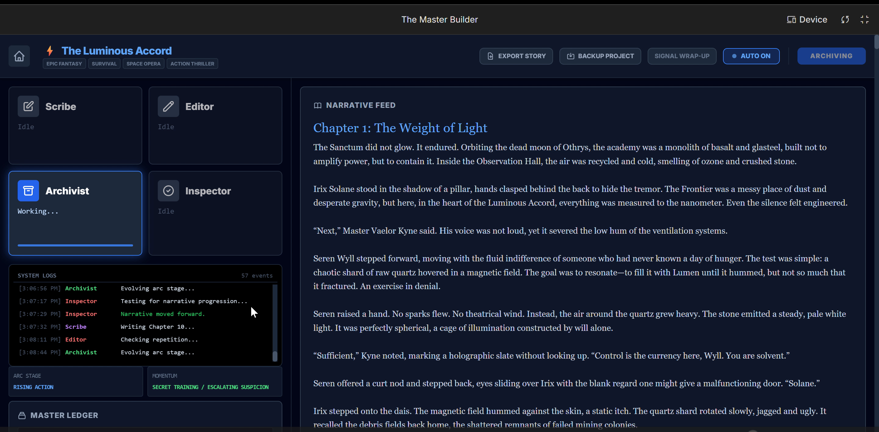 "We plan to continue expanding the system's ability to handle the creation of full-length novels of 88+ chapters, further refining the agents' interactions and world-state management."