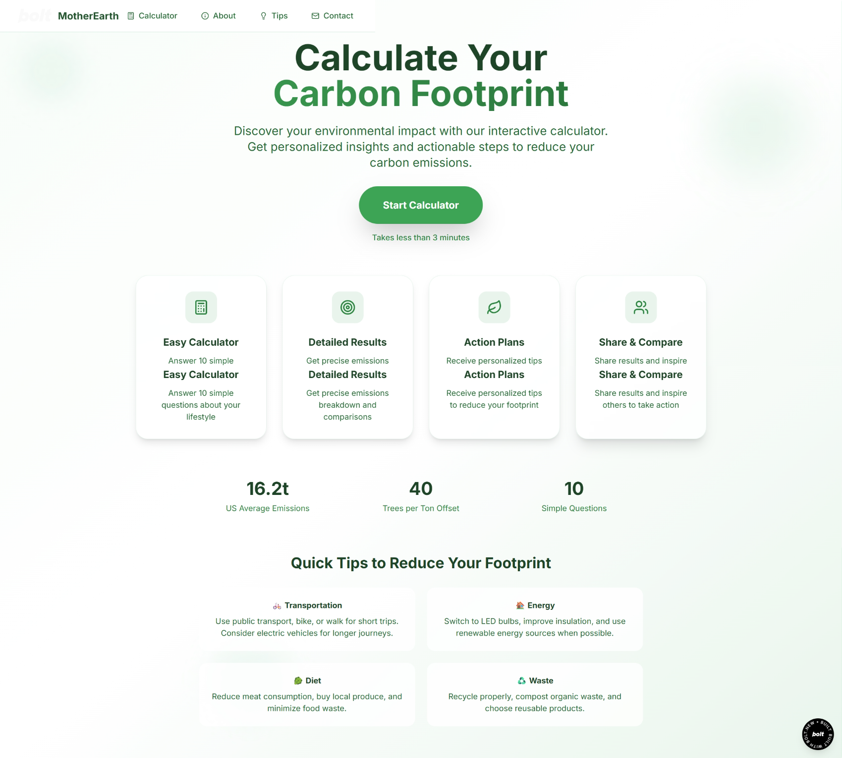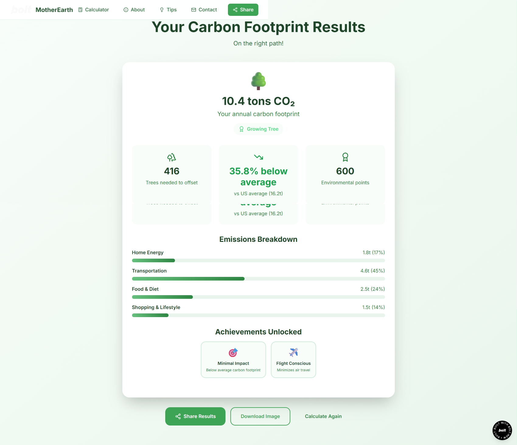 I learned that proper planning and research are more valuable than technical skills when building with AI tools. Spending 2+ hours on research and prompt engineering made the difference between a generic calculator and something that actually addresses real user needs. I also discovered that combining multiple AI tools (Claude, Gemini, Bolt.new) creates better results than relying on just one. Most importantly, I learned that making environmental tools approachable and non-intimidating is crucial - people want to help the planet, but they don't want to be scared into action.