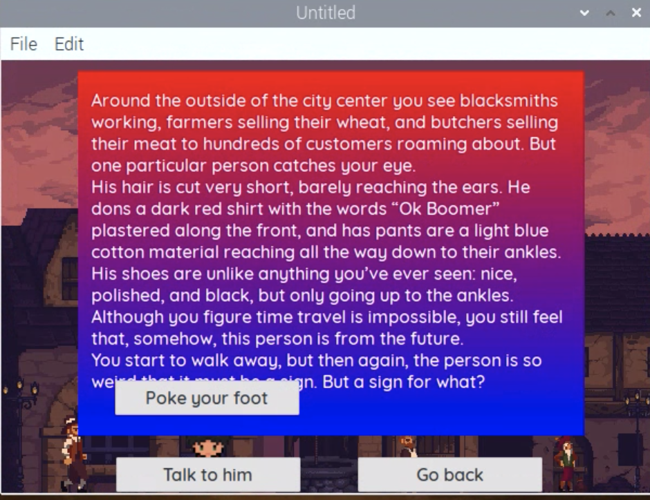Overall our team is most proud of how we were able to learn an entirely new coding language and develop a fully developed plot in less than 3 days. Learning Xojo was a tough obstacle to overcome, but with the help of each other (and a bit of google along the way) we were able to create a fully functional app using an app we had never used before. In addition, we created a story that we are truly proud of, and although we don't get to showcase the full script in our project, we're still really proud of the progress that we made given all our obstacles during this hackathon! In addition, we're really proud of the "Poke Your Foot" easter egg button. After entering the village, if you choose to go North towards the city center, then every 3 seconds a button will pop up at random spots on your screen prompting you to "Poke Your Foot." Although it may seem like a bug, it is very intentional, and should you choose to press the button it will yield a nice surprise!