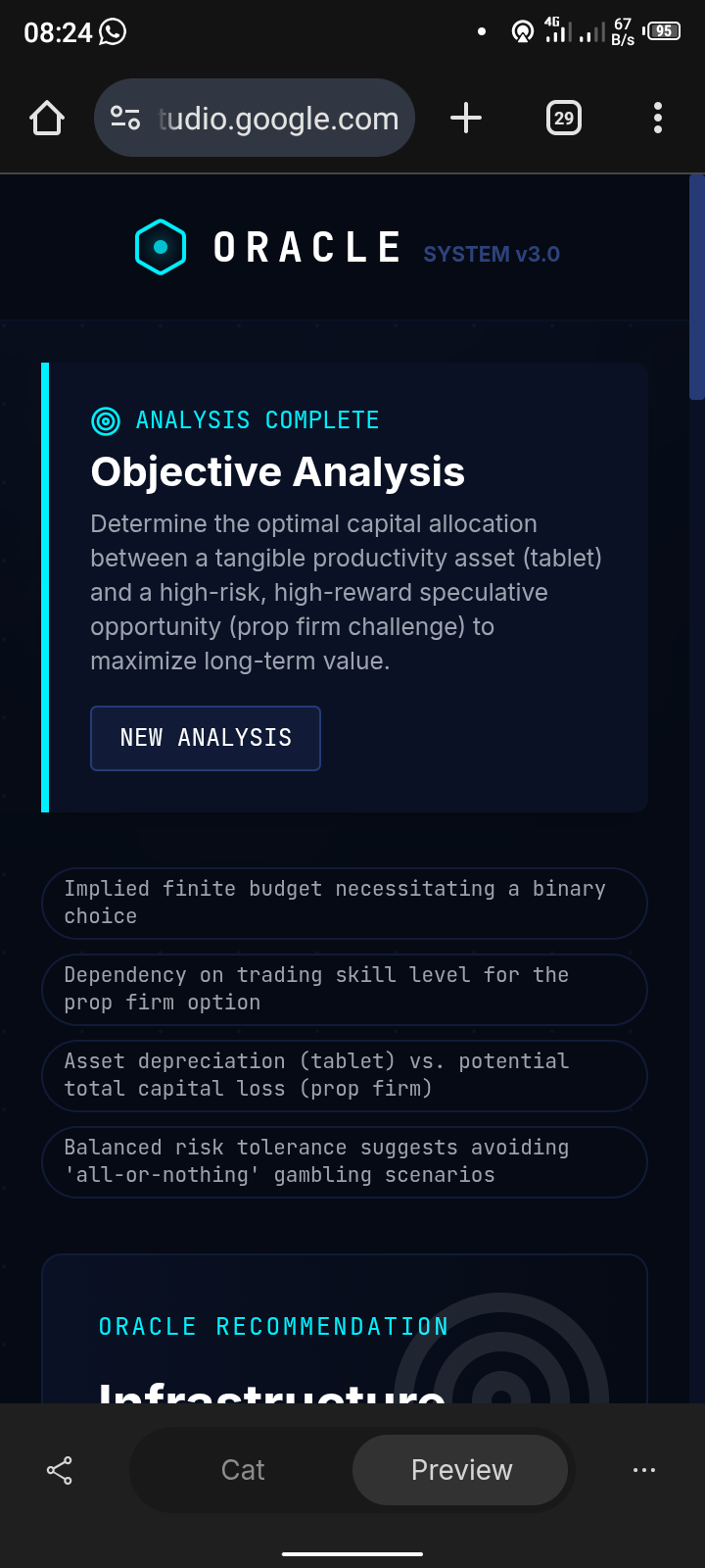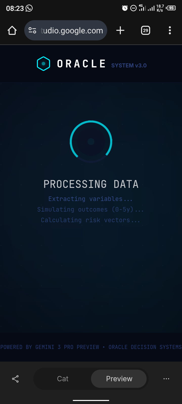 THE ORACLE analyzes complex decisions by extracting constraints, generating multiple strategic options, simulating short-term � and long-term � outcomes, and scoring each option on feasibility, risk, impact, and opportunity cost. The results are presented in a clear, decision-focused layout.