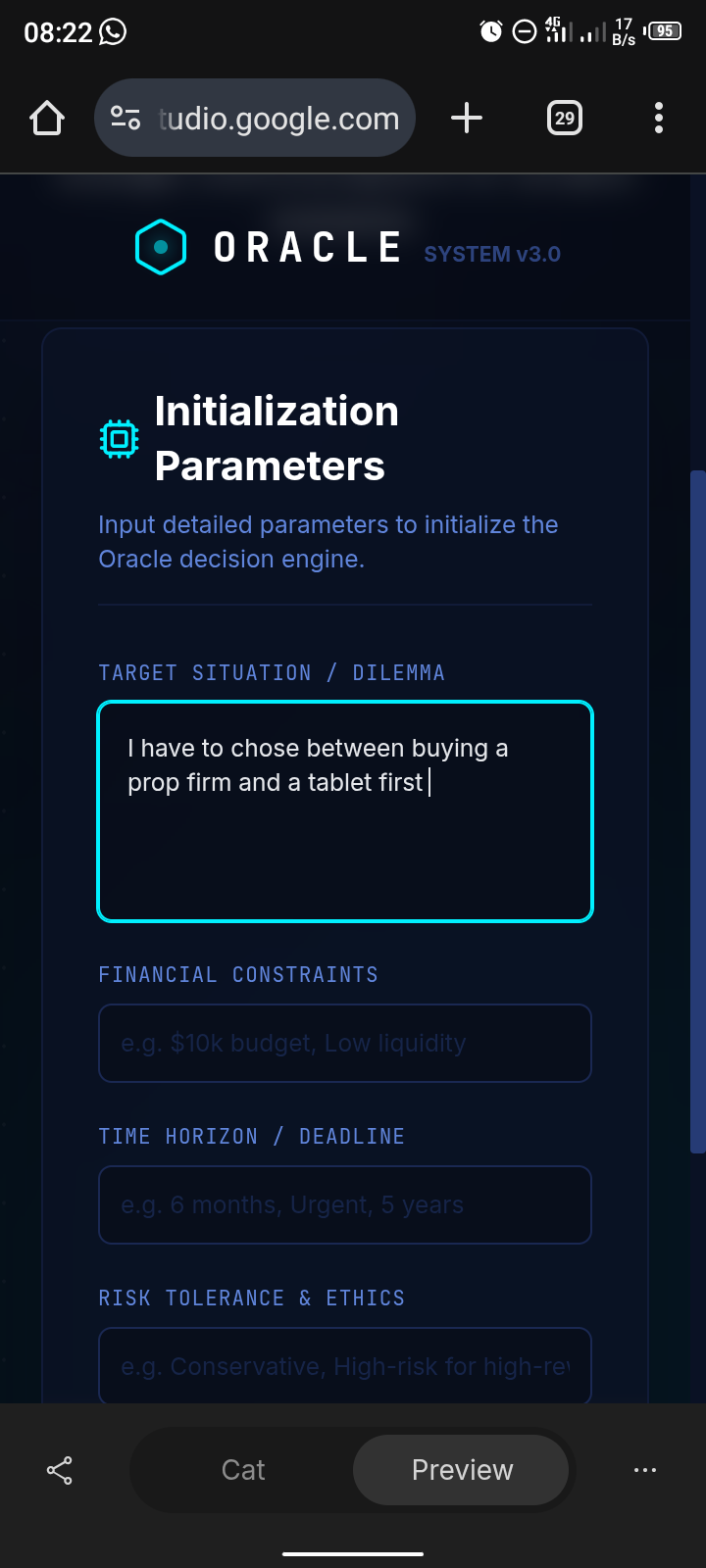 Many people struggle to make high-stakes decisions because advice is often vague, biased, or unstructured. We wanted to build a system that treats decisions as analytical problems, not casual conversations. This led to THE ORACLE, a structured AI decision-reasoning assistant.