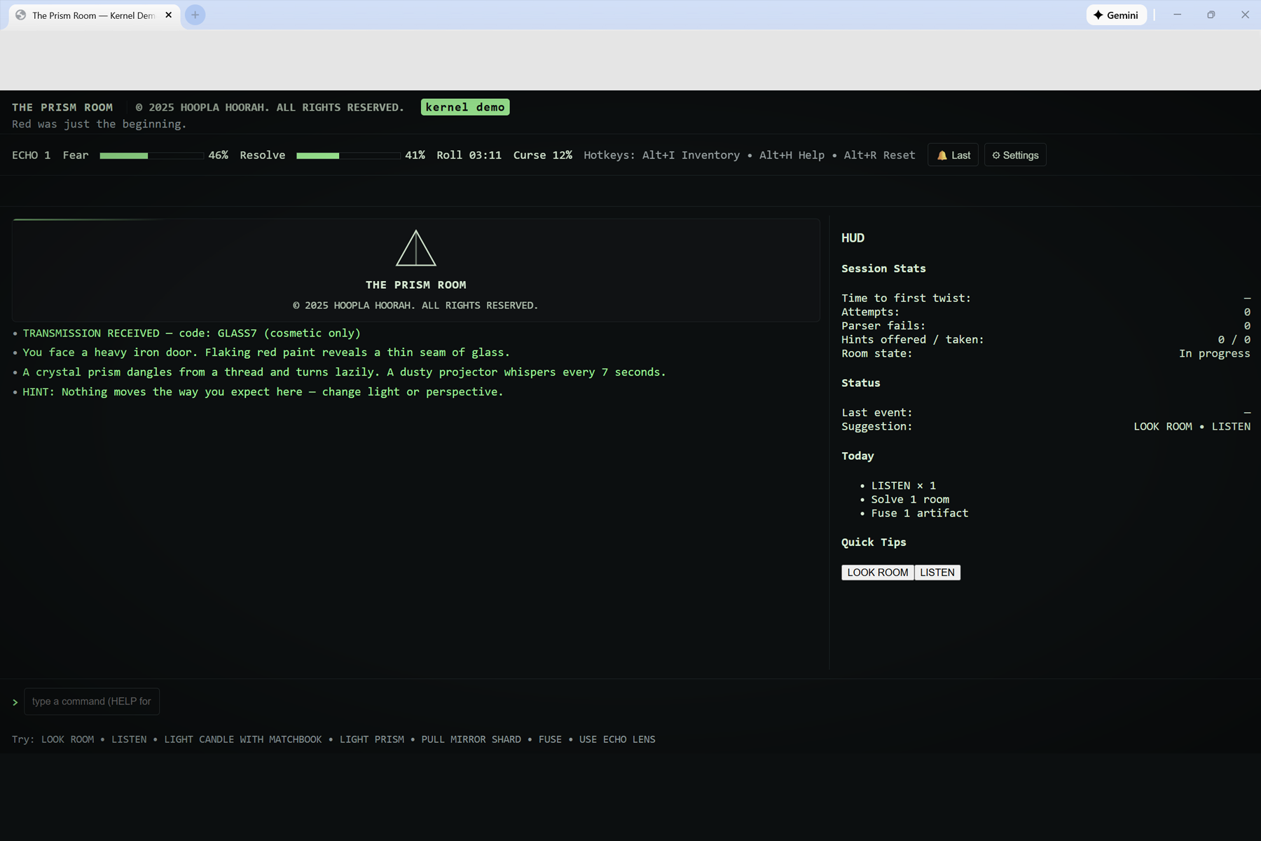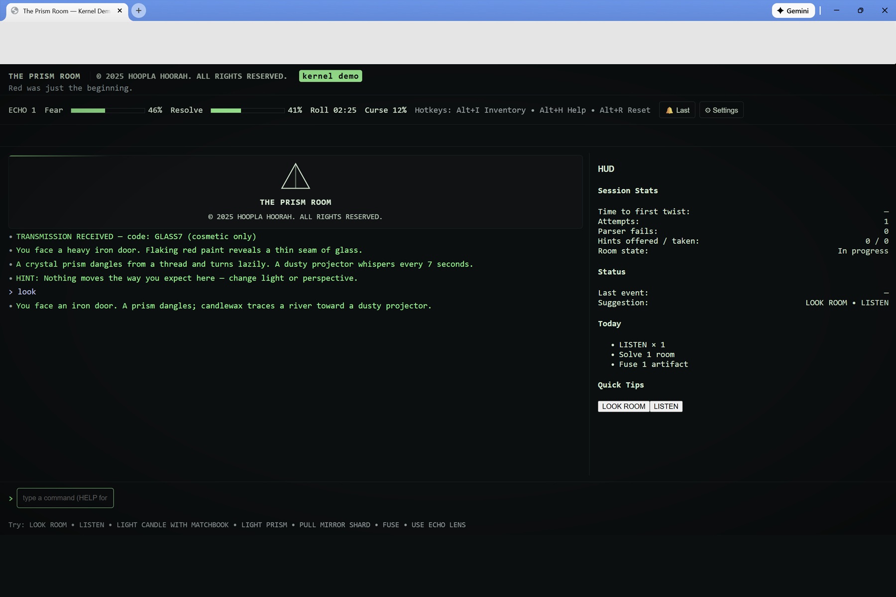 Starting HUD: The Prism Room kernel demo boots up with the iron door, GLASS7 transmission, and first ambient hint.