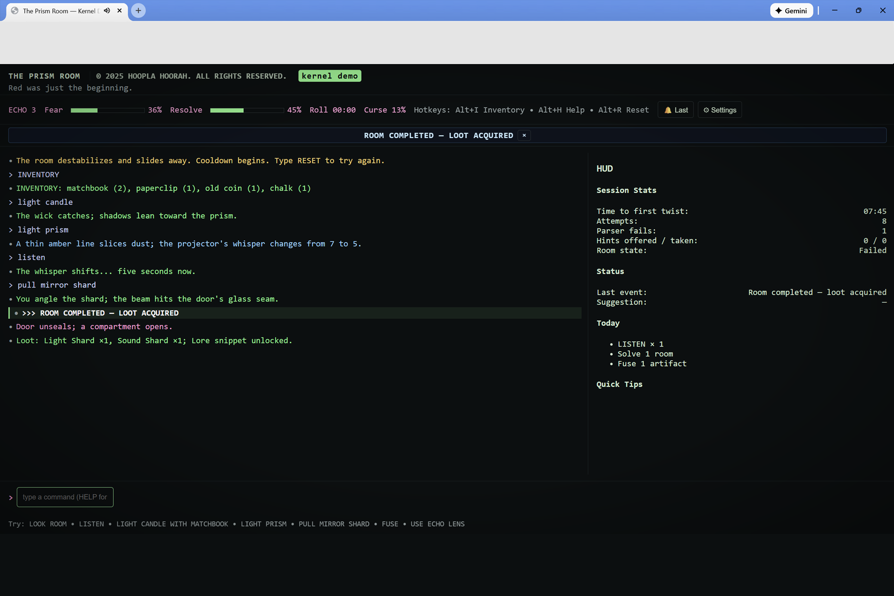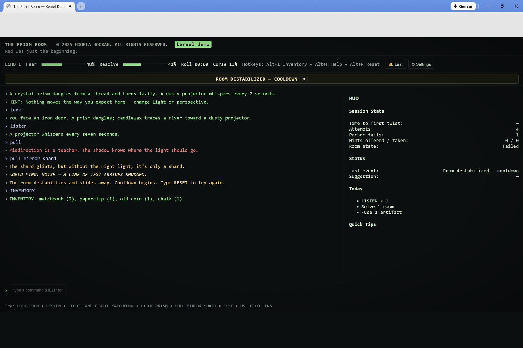 Inspired by H. G. Welles' "The Red Room" and the Kiroween theme, we set out to build a tiny, testable room loop kernel for a larger interactive fiction project called The Prism Room. Instead of a full game, we focused on a single haunted door, a tight HUD, and a short, replayable loop that could be cloned into future rooms.