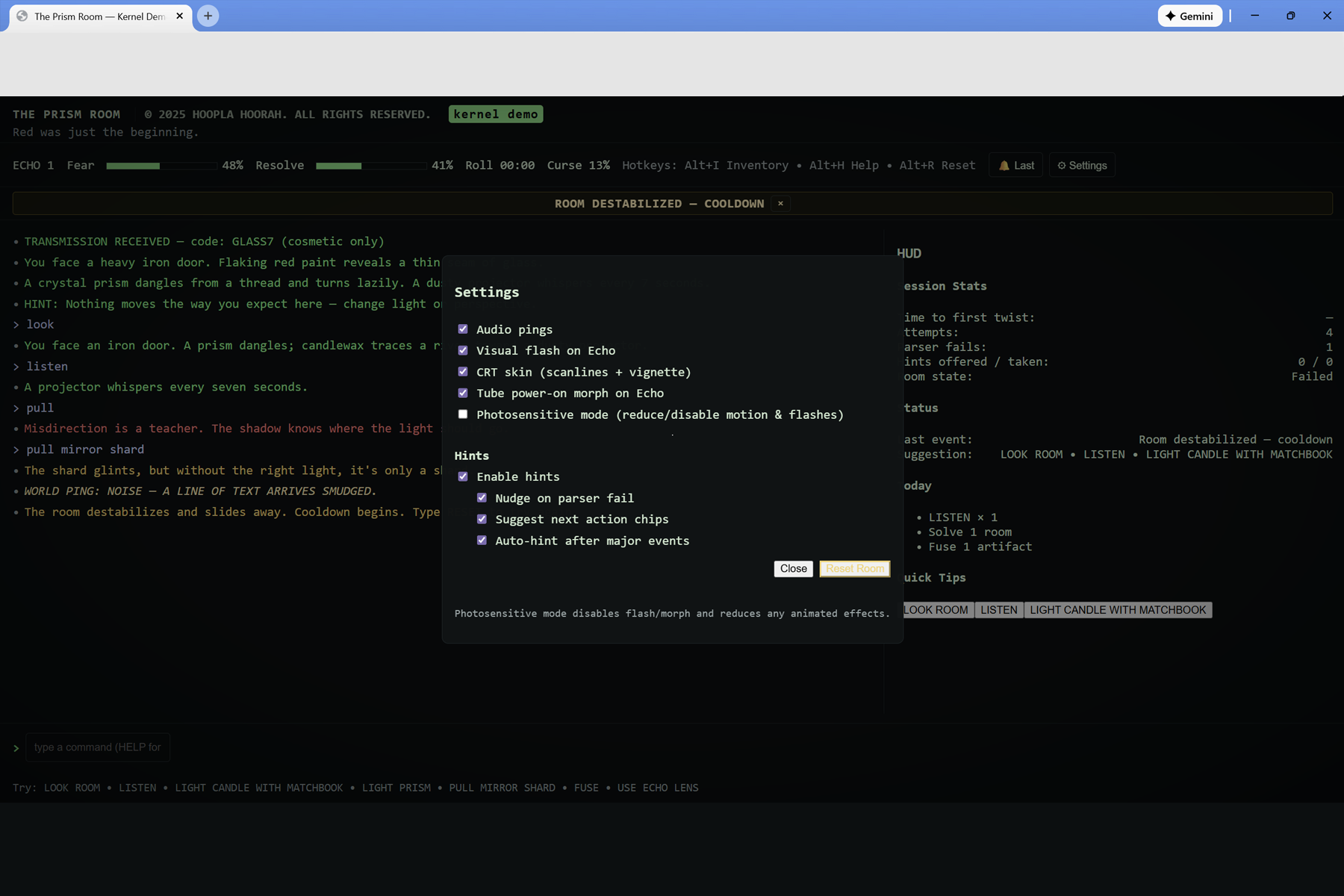 LOOK ROOM,LISTEN,LIGHT PRISM,PULL MIRROR SHARD,FUSE, andUSE ECHO LENSto progress through the loop. - Open Settings to enable Photosensitive Mode, toggle hints, mute the audio ping, or reset the room for another run.