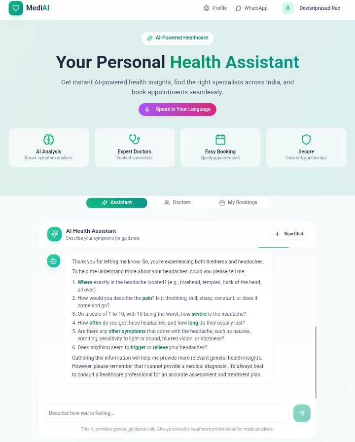 Refined Symptom Analysis Flow MediMind now asks smarter follow-up questions, resulting in more accurate and context-aware suggestions.