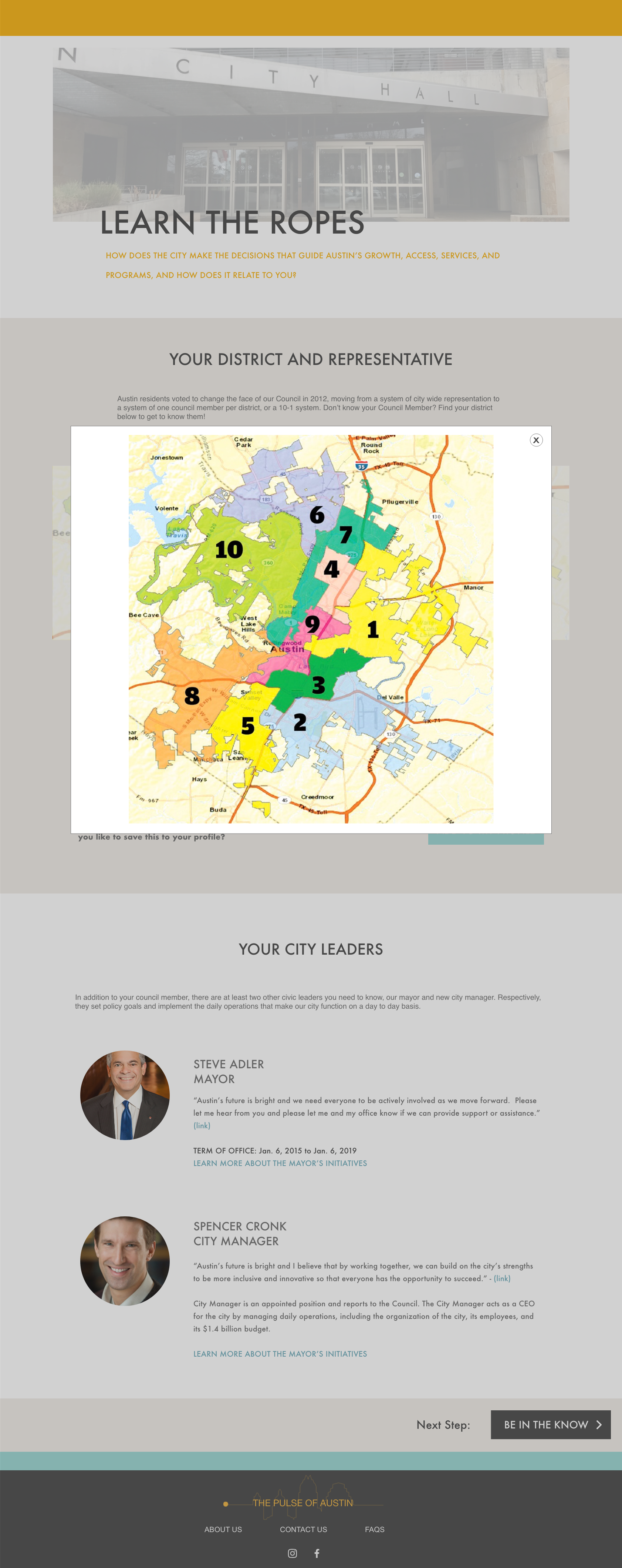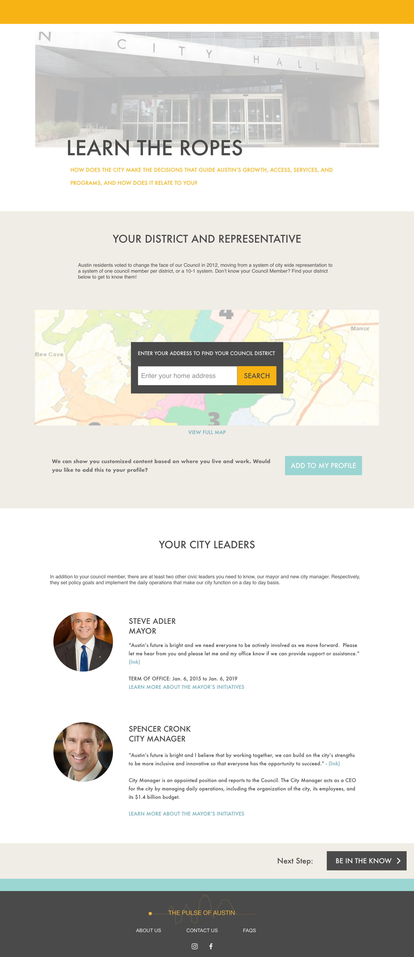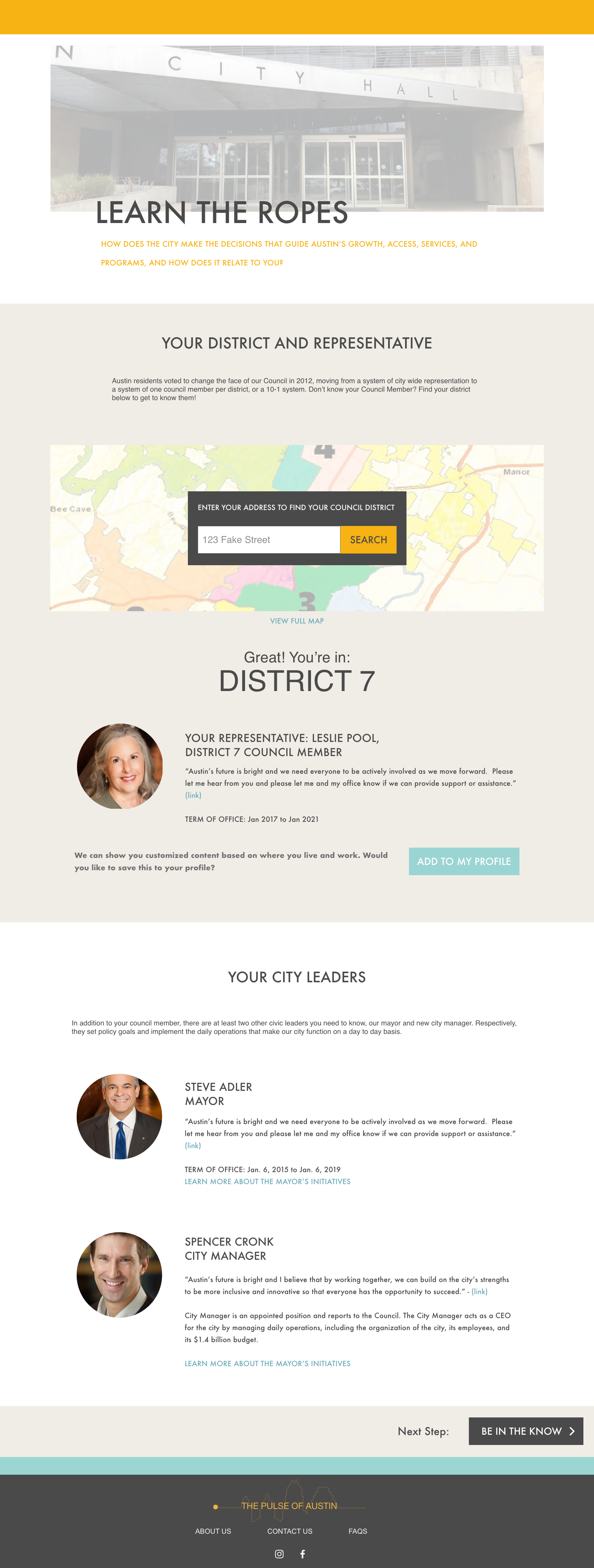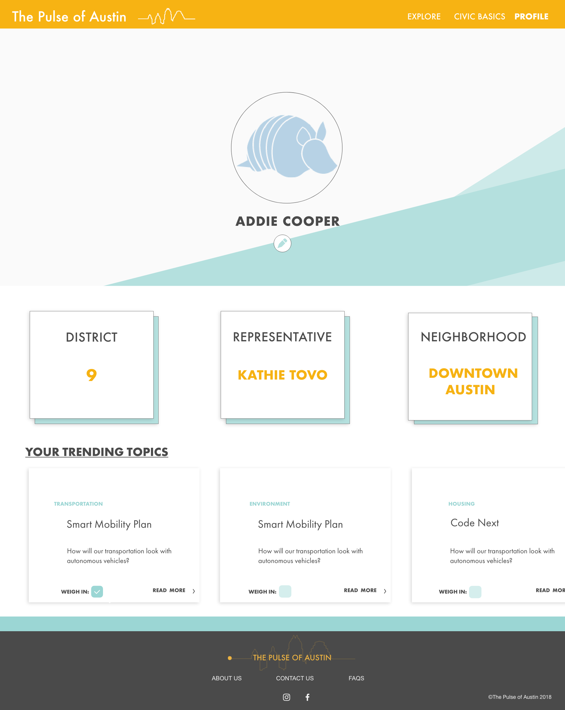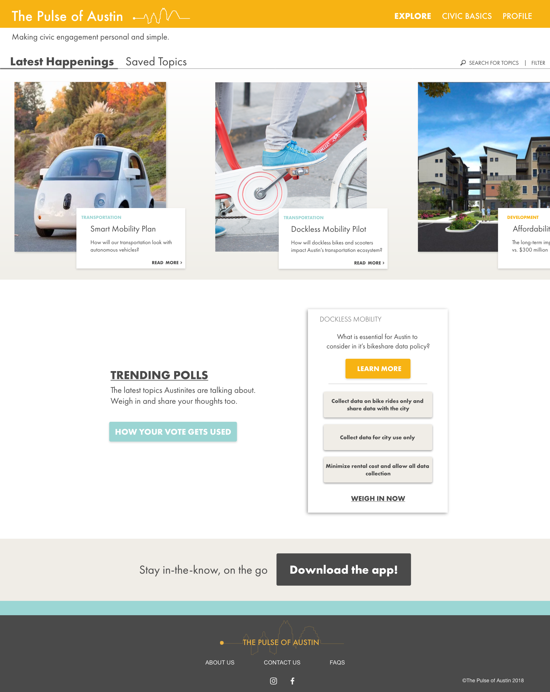 The Pulse of Austin gives residents a foundation of how local government works, showing them simple things like who their representative is and what district they live in. Next, we give Pulse users bite-sized updates on city-level projects and decisions happening around where they live, work, and spend their time. In this way, people begin to see how government functions related to their lives. From here, residents develop “civic confidence” and feel compelled to share their voice. Through either a simple poll or free text input, people can weigh in easily without having to attend inconvenient meetings or taking lengthy surveys. Finally, we are working closely with the City of Austin in order to shape opportunities that have the biggest potential for impact.