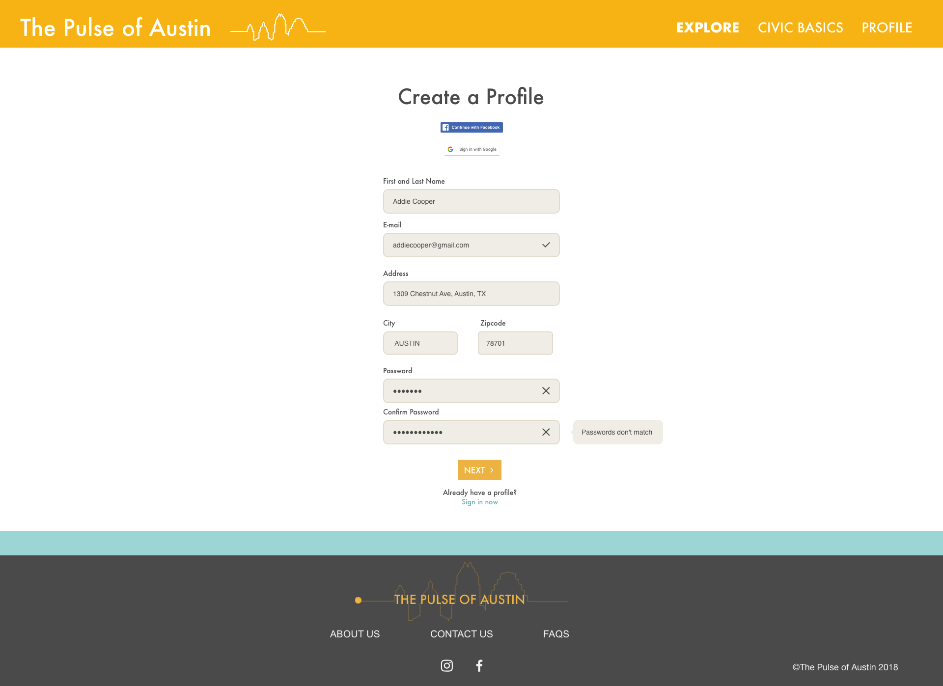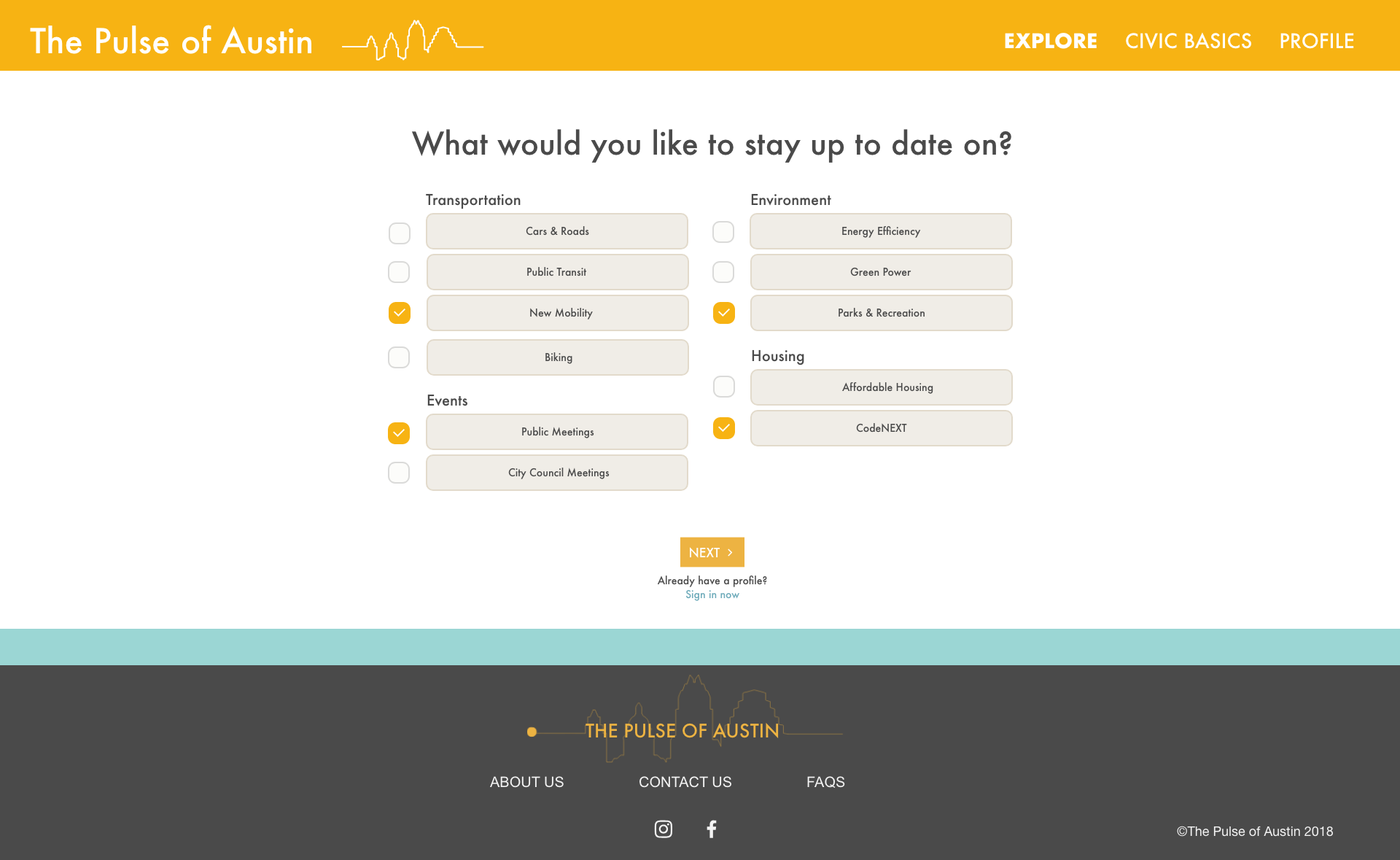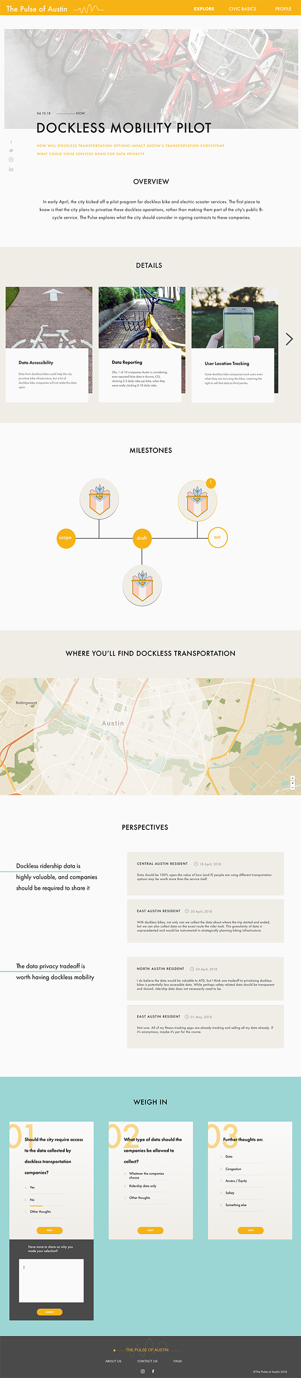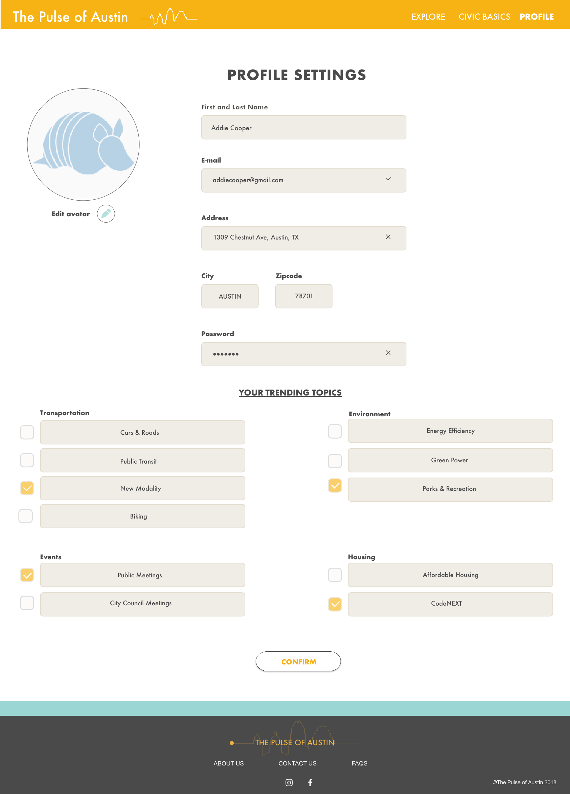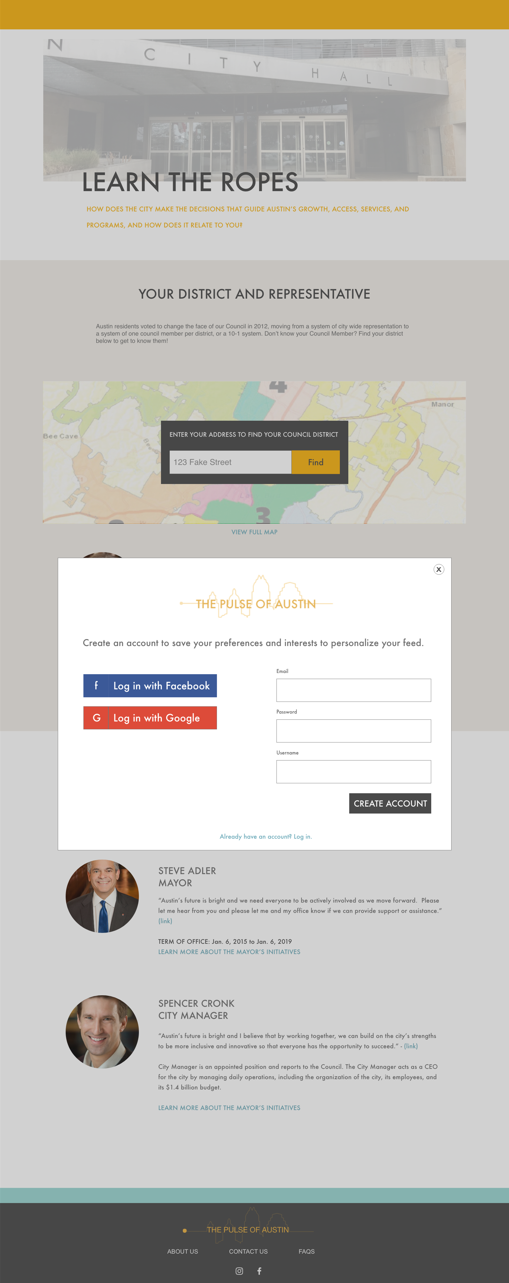 The Pulse of Austin gives residents a foundation of how local government works, showing them simple things like who their representative is and what district they live in. Next, we give Pulse users bite-sized updates on city-level projects and decisions happening around where they live, work, and spend their time. In this way, people begin to see how government functions related to their lives. From here, residents develop “civic confidence” and feel compelled to share their voice. Through either a simple poll or free text input, people can weigh in easily without having to attend inconvenient meetings or taking lengthy surveys. Finally, we are working closely with the City of Austin in order to shape opportunities that have the biggest potential for impact.