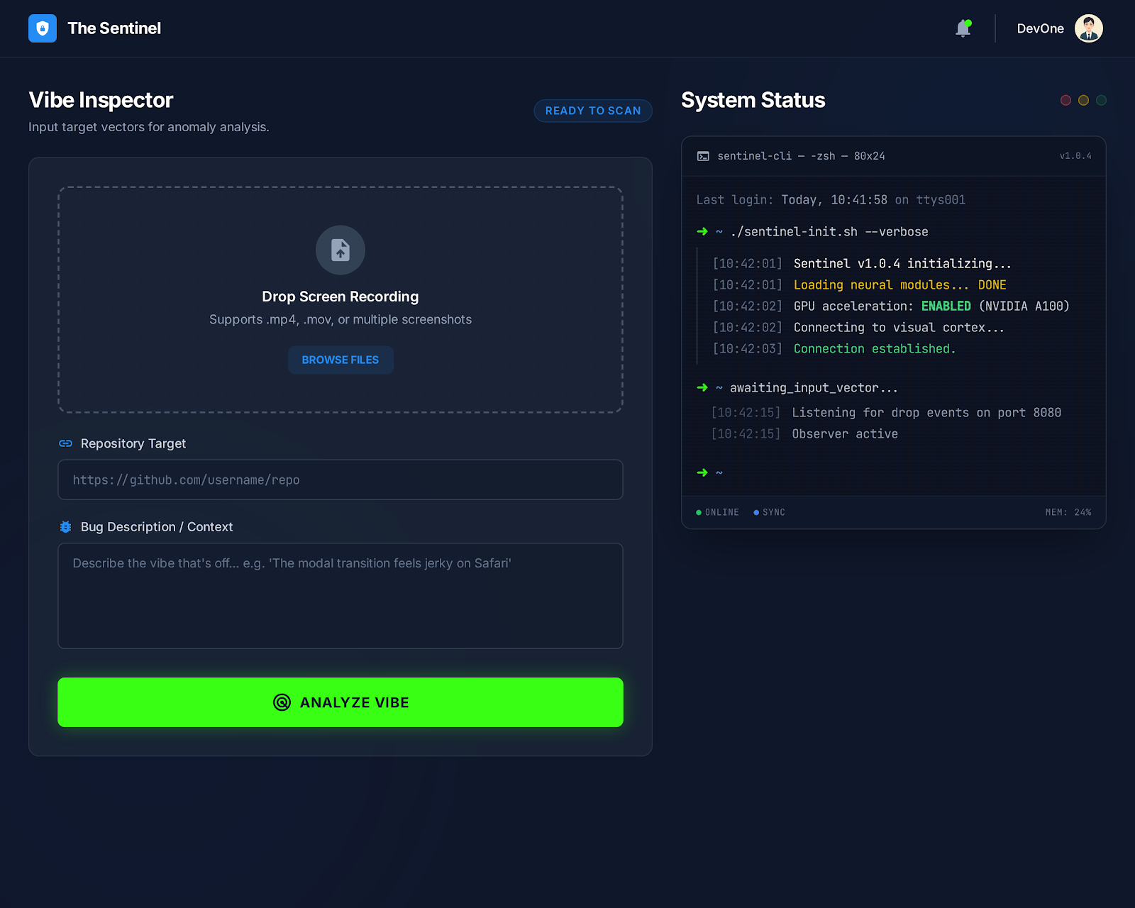 The Sentinel is an autonomous visual bug detection and repair agent. Users upload a screenshot or screen recording of a UI issue (or paste a deployed URL for automatic capture), point it at a GitHub repository, and describe what looks wrong in plain English. The Sentinel then: