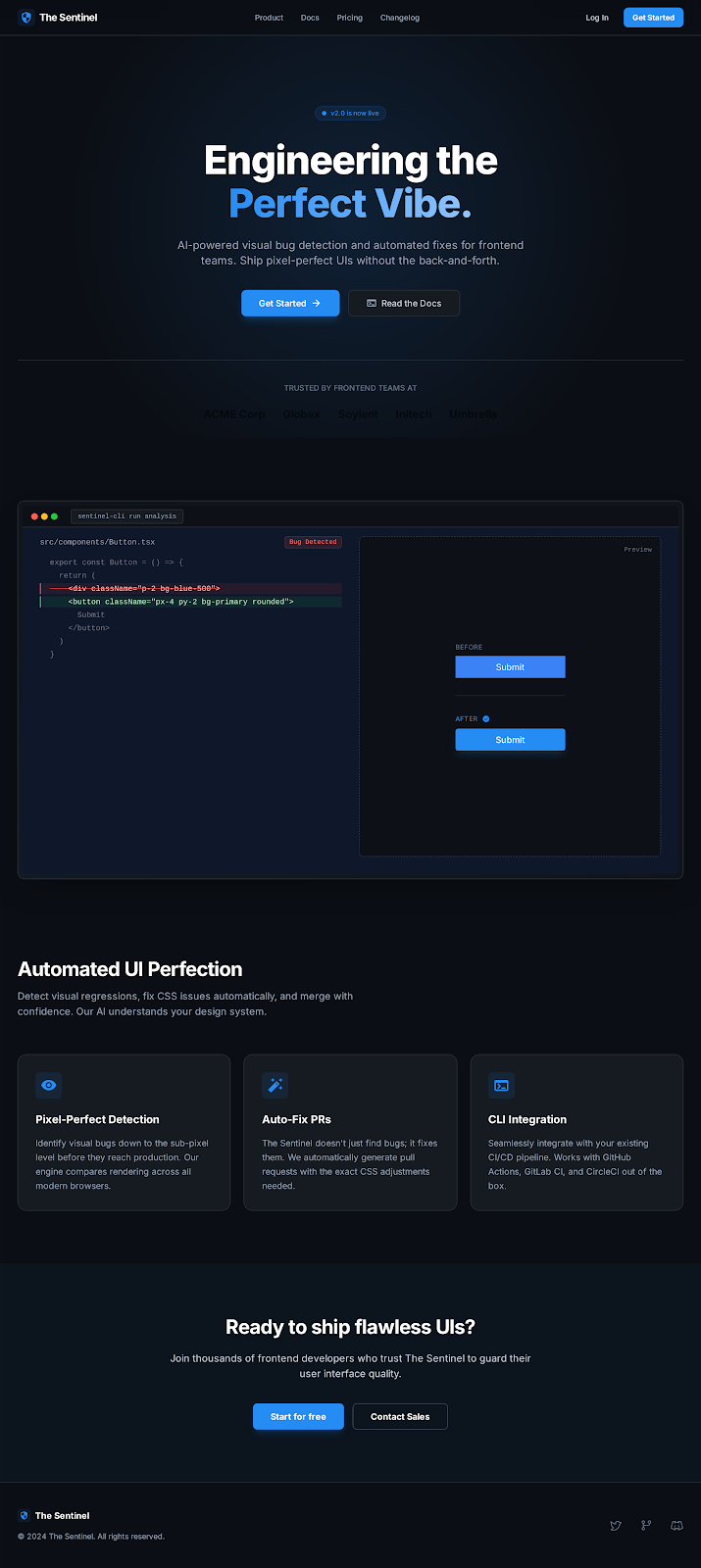 - Figma-to-Code Diffing: Upload a Figma design and a deployed URL — The Sentinel identifies every pixel-level deviation and fixes them all in one PR